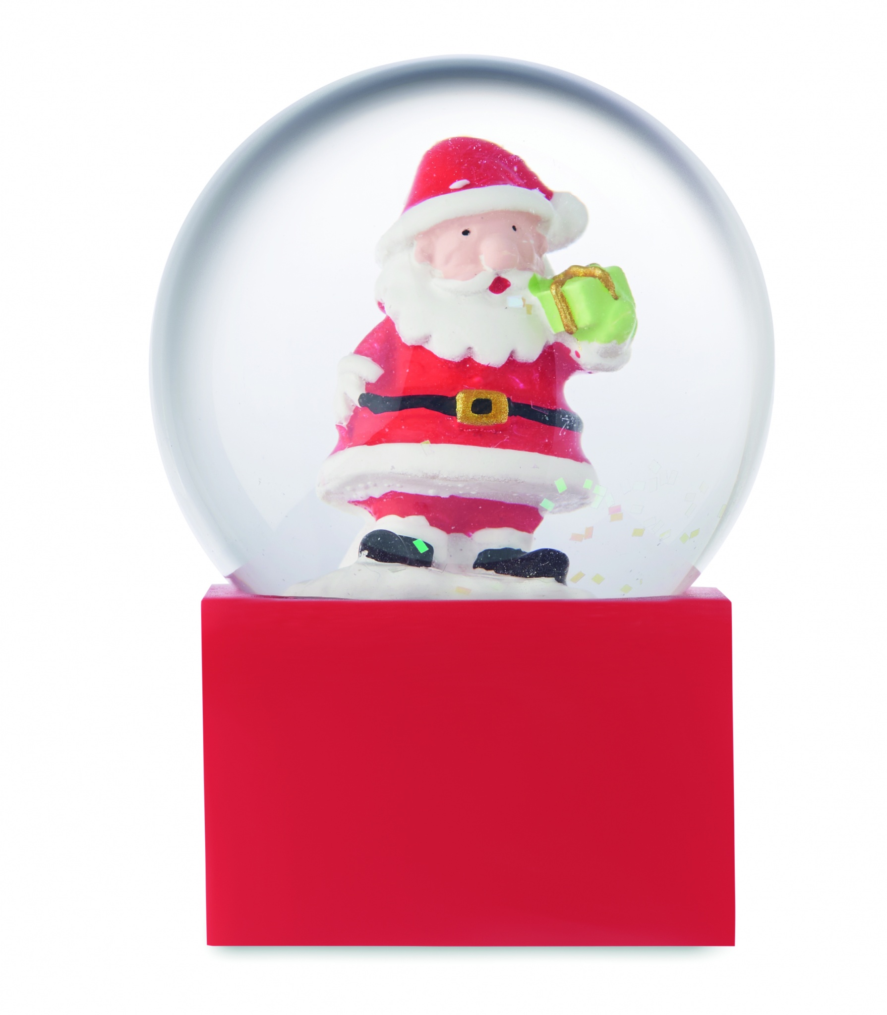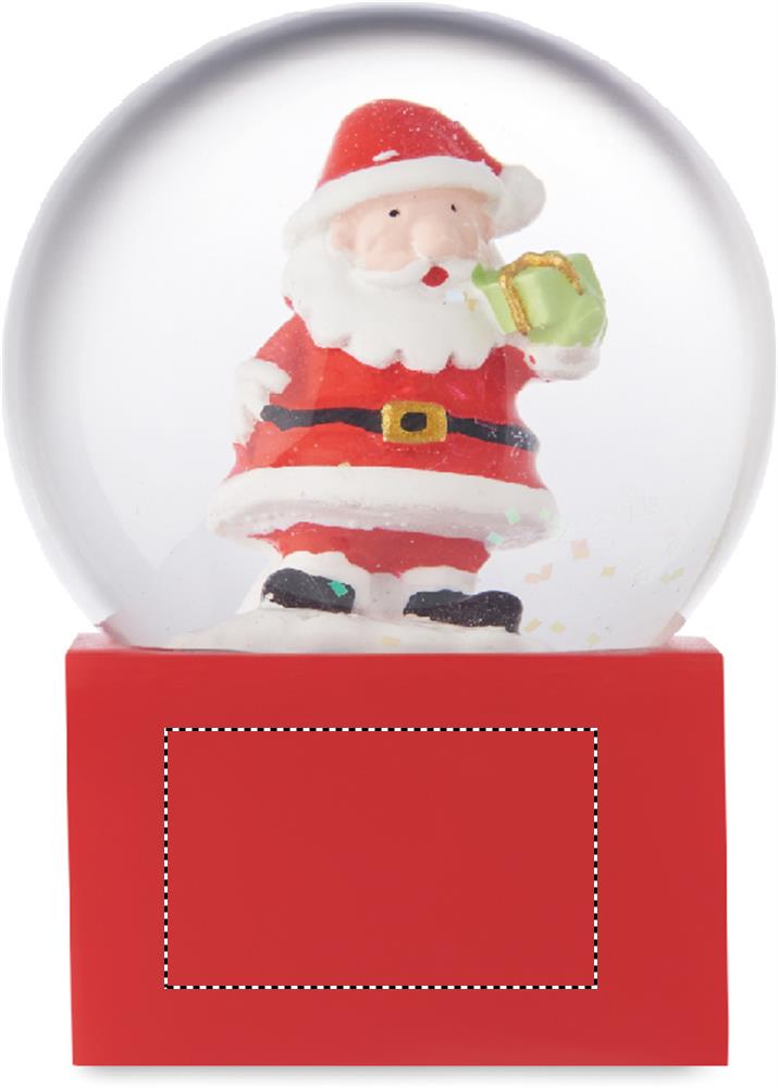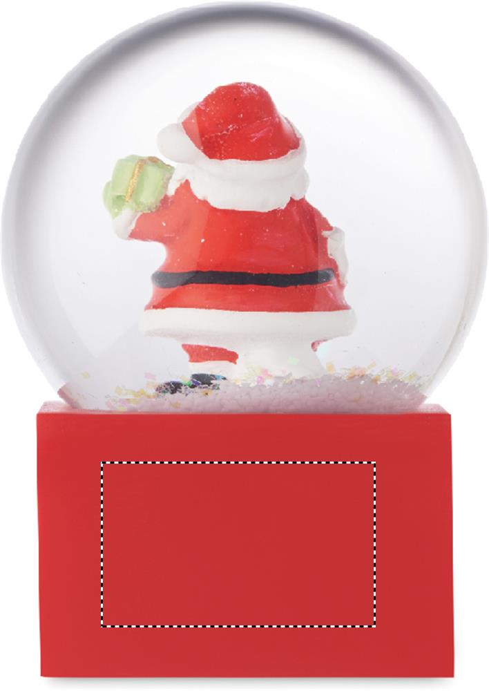 Pieni jouluinen lasinen lumipallokoriste, jossa on polyresiinipohja.
