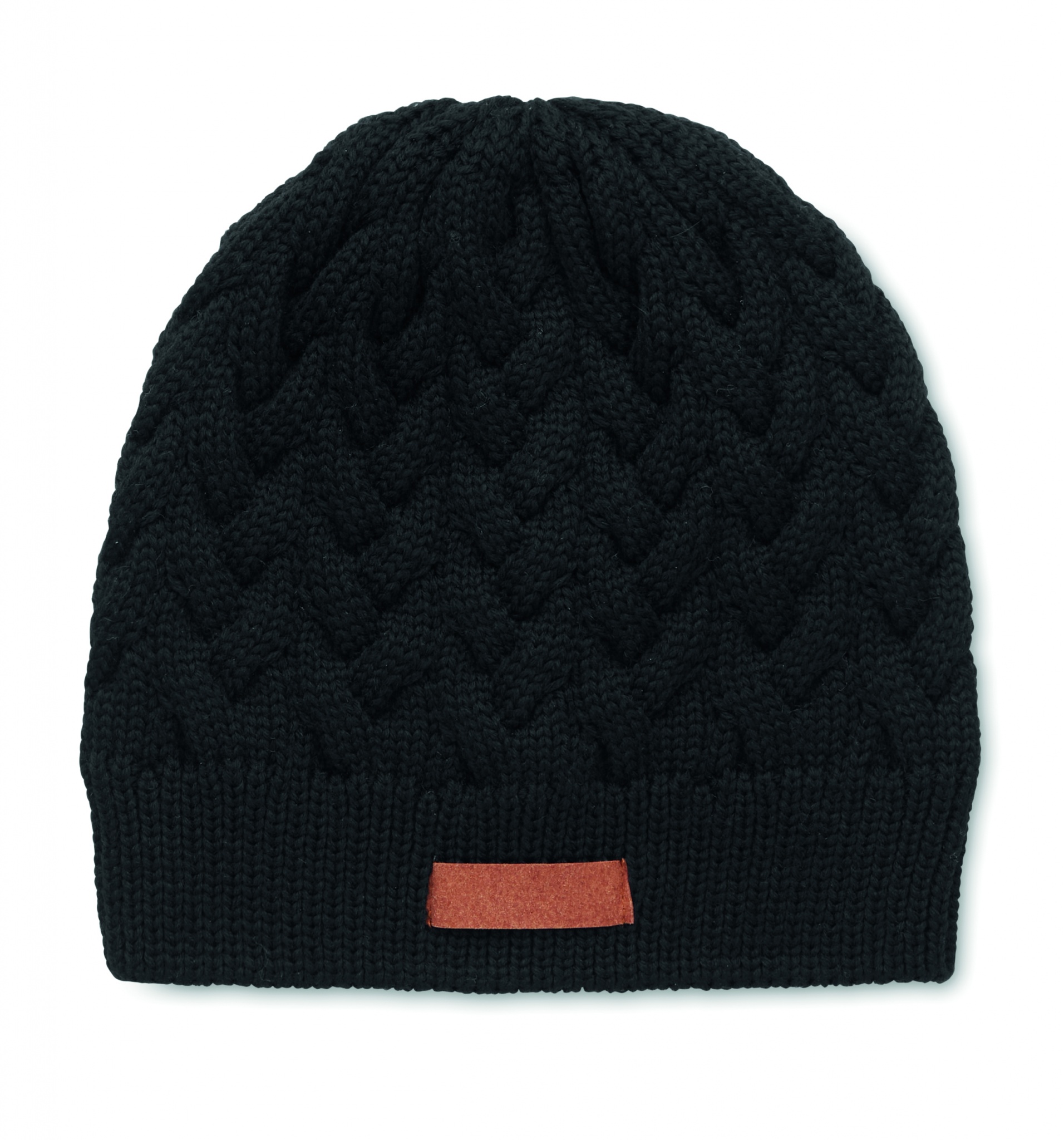Neulottu RPET pipo, tuotteessa etiketti painatusaluetta varten.