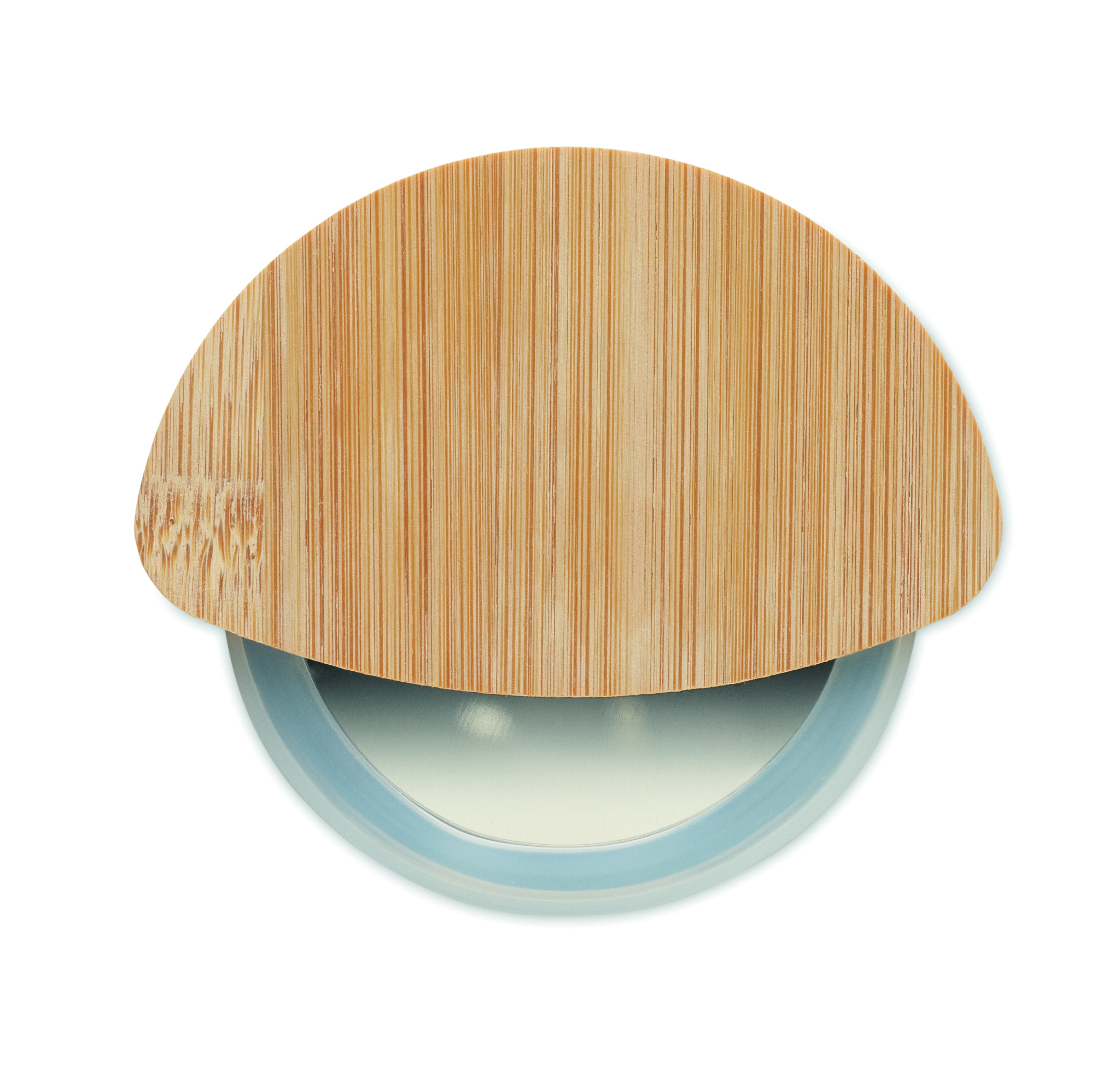 Pyöreä pizzaleikkuri, jossa on bambukahva ja ruostumattomasta teräksestä valmistettu terä. Sisältää läpinäkyvän valkoisen silikonisuojuksen.