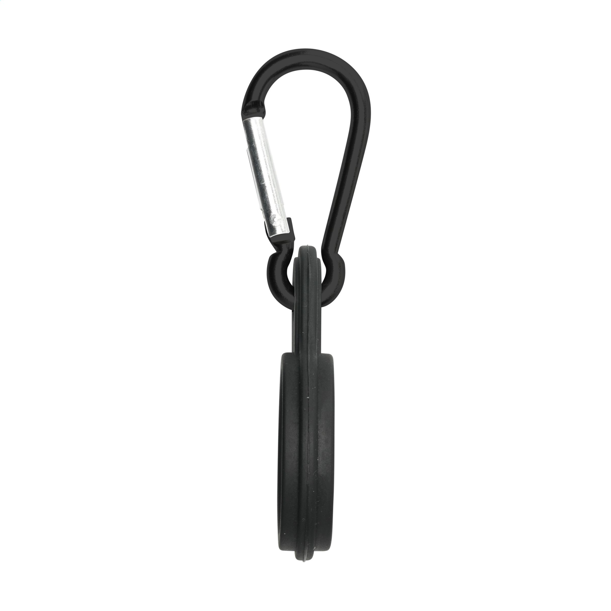 Silikonilenkki, jossa karabiini. Kiinnitä joustava lenkki juomapulloon, jotta pullo voidaan kiinnittää reppuun tai urheilukassiin karabiinihaarukalla.