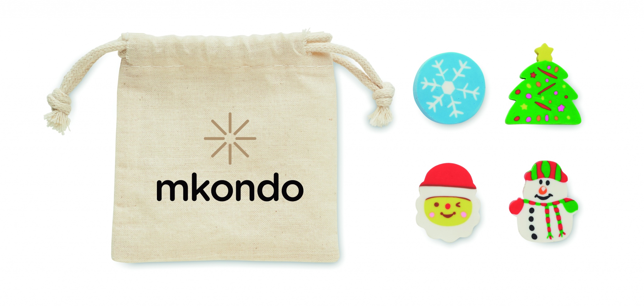 4 erilaista jouluaiheista pyyhekumia: lumihiutale, joulupukki, joulukuusi ja lumiukko. Puuvillaisessa kiristysnauhapussissa.