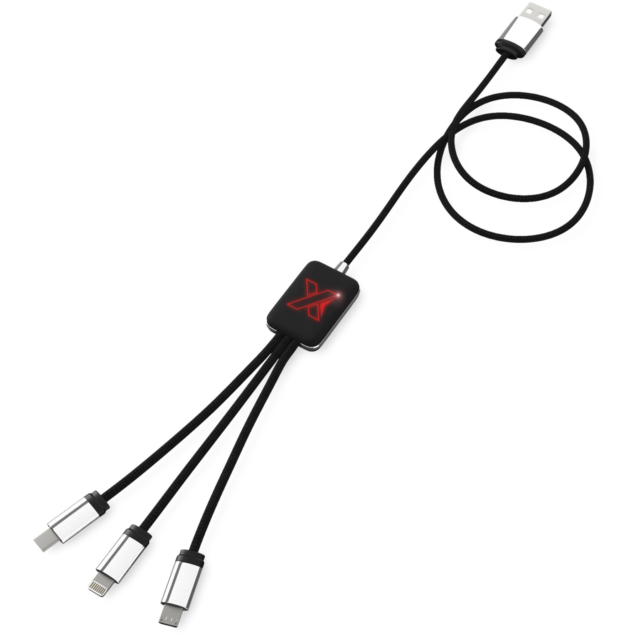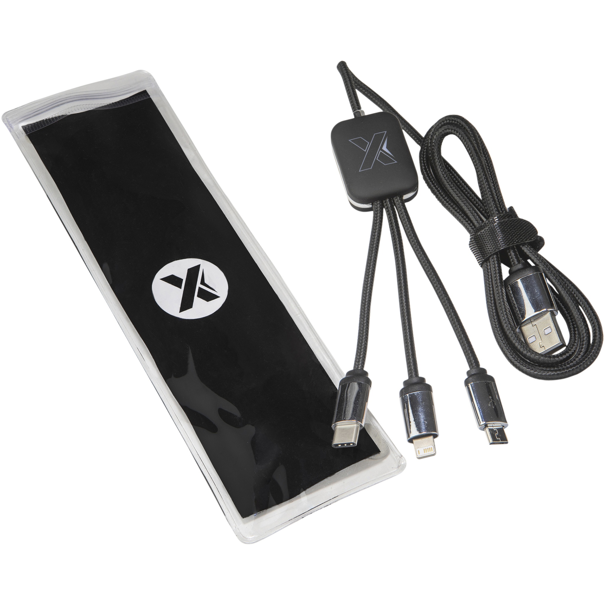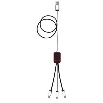 Valaistuvalla logolla varustettu latauskaapeli, kumi ja metalli viimeistely, kolmella liittimellä (Type-C, Android, iPhone). Jopa kolmea laitetta voidaan ladata samanaikaisesti. Kaapelin pituus (mukaan lukien pistokkeet): 10 cm. Kaapelin kokonaispituus: 1 metri. Johtojen materiaali kierrätys RPET muovi, pakkaus on valmistettu kierrätetystä paperista ja kierrätetystä muovista.