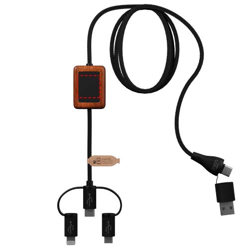 Bambupintainen, kumiviimeistelty latauskaapeli tiedonsiirrolla ja kaksinkertaisella valaistuvalla logolla. Kaapeli on valmistettu ympäristöystävällisistä materiaaleista: kierrätetystä ABS-muovista ja rPET-muovista, jota saadaan kierrätetyistä pulloista. Toimii Apple CarPlayn ja Android Auto -autosovellusten kanssa. Kahden USB-A- ja USB-C-liitännän ansiosta kaapeli on täysin yhteensopiva markkinoiden uusimpien tietokoneiden (USB-C) kanssa. Kaapeliin voidaan lisätä kaksi yksilöllistä valaistua logoa (yksi kummallekin puolelle). Johdon pituus: 1 metri. Toimitetaan TPU-pussissa (17,5 x 5,5 cm) paperikortin kanssa. Kolmen vuoden takuu.