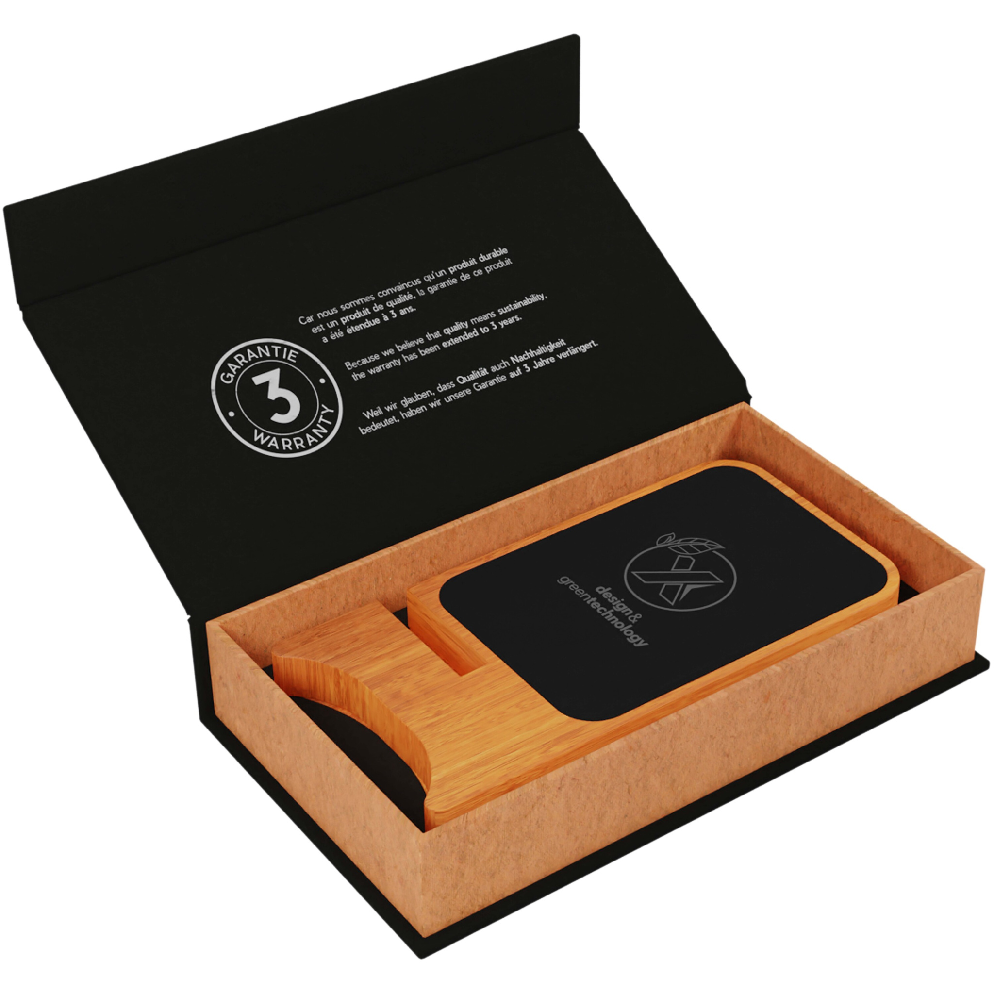 Kumista ja bambusta valmistettu 10 W:n langaton latausalusta, jossa antibakteerinen käsittely ja valaistuva logo. Type-C-tulo. Toimitetaan mustassa kierrätetystä voimapaperista valmistetussa lahjapakkauksessa, jonka mukana tulee kierrätetystä RPET-muovista valmistettu kaapeli. Patentti EUROPE EUIPO.