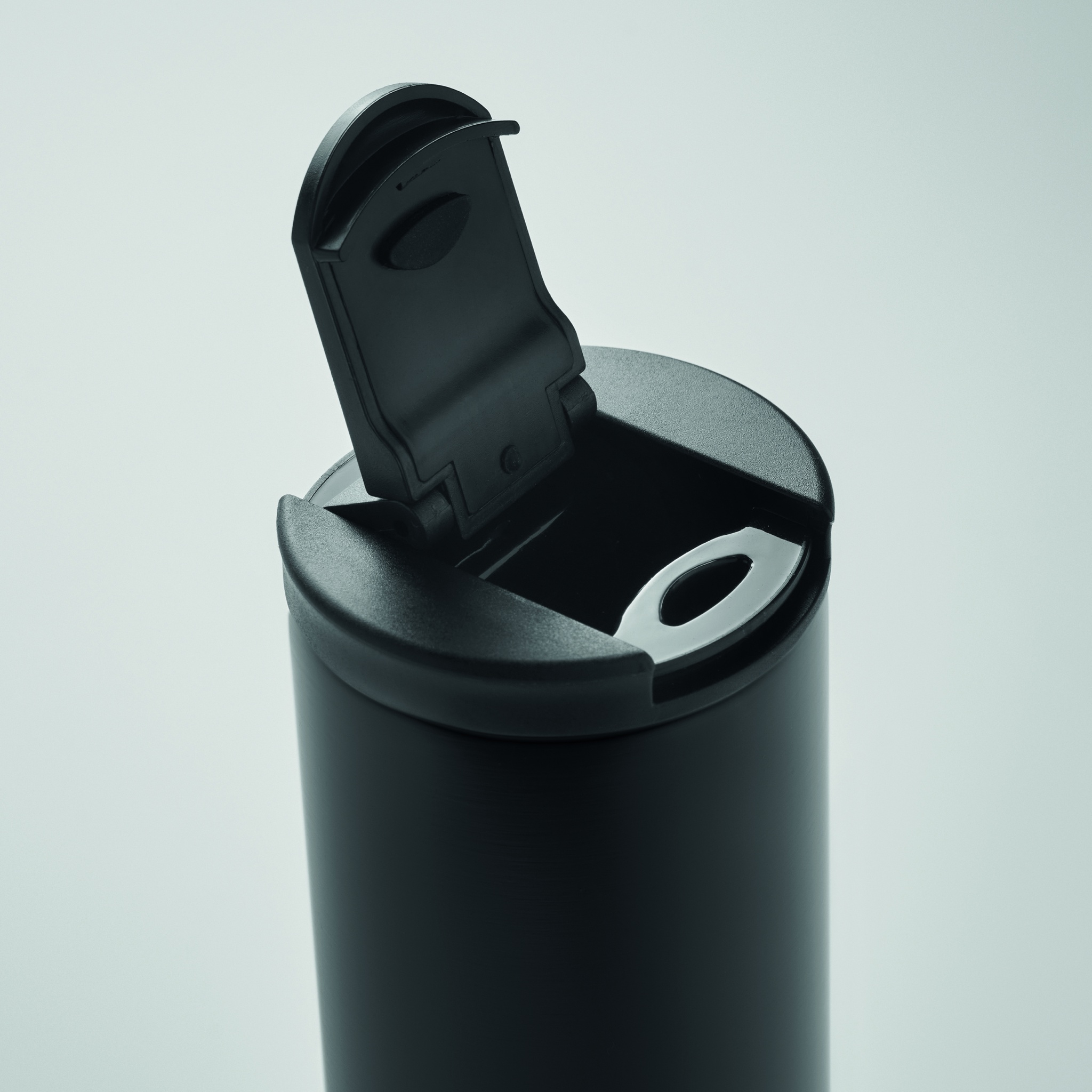 Kaksiseinäinen ruostumattomasta teräksestä valmistettu termosmuki, jossa juomakansi. Tilavuus 330 ml. Vuotamaton.