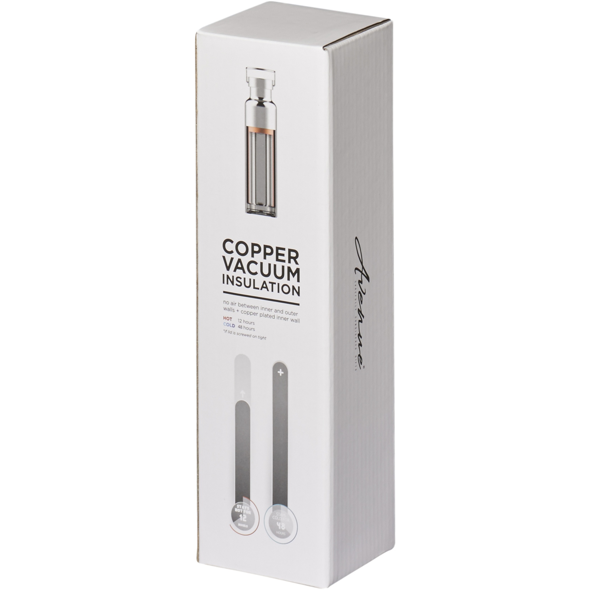 Kestävää ruostumatonta terästä. Kuparieristetty tyhjiörakenne, jonka ansiosta juoma pysyy kylmänä 48 tuntia ja vähintään 12 tuntia kuumana. Rakenne estää myös nesteen tiivistymisen pullon ulkopuolelle. Trendikäs, kestävä jauhemaalaus. Ruostumattomasta teräksestä valmistettu ruuvattava kierrekorkki ja kestävä käsilenkki. Leveä suuosa helppottaa täyttöä ja kaatamista. Täydellinen jääpaloille. Tilavuus 650 ml. Avenue-lahjapakkaus.
