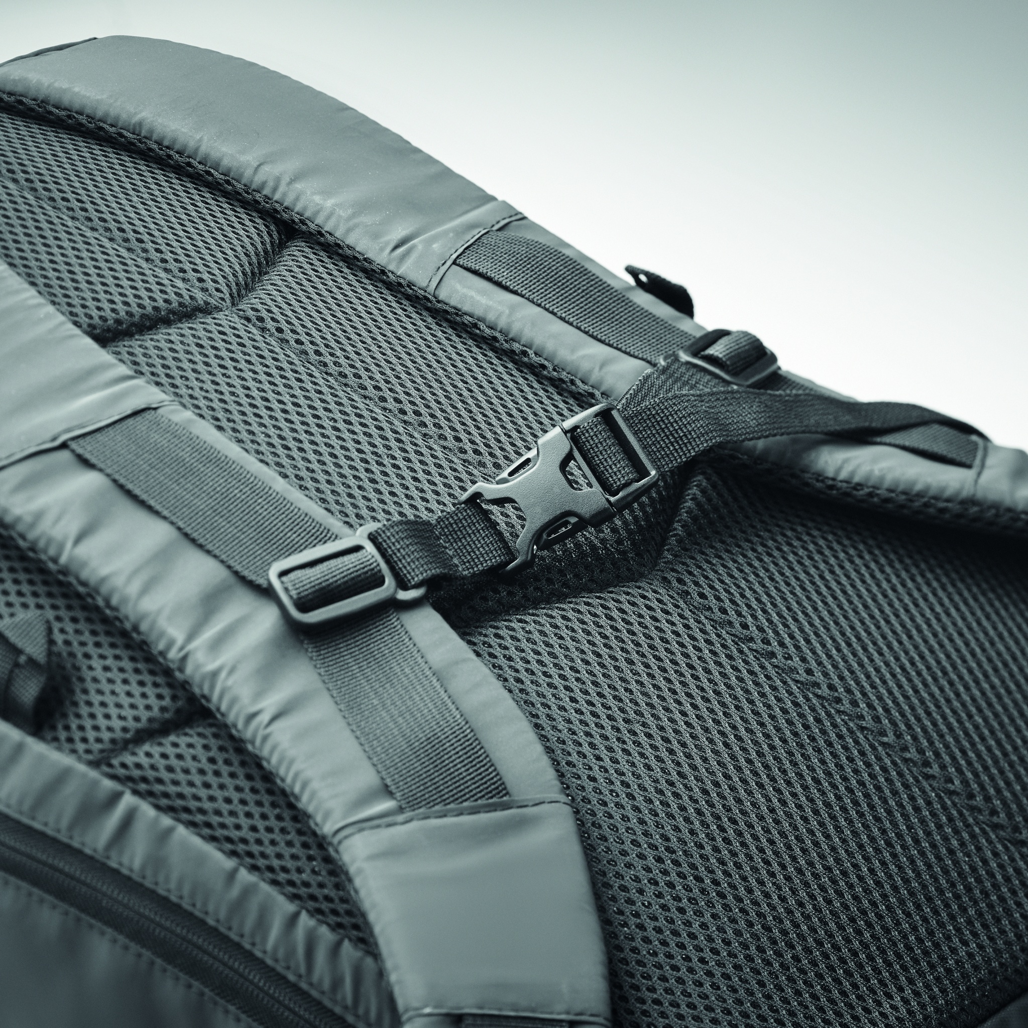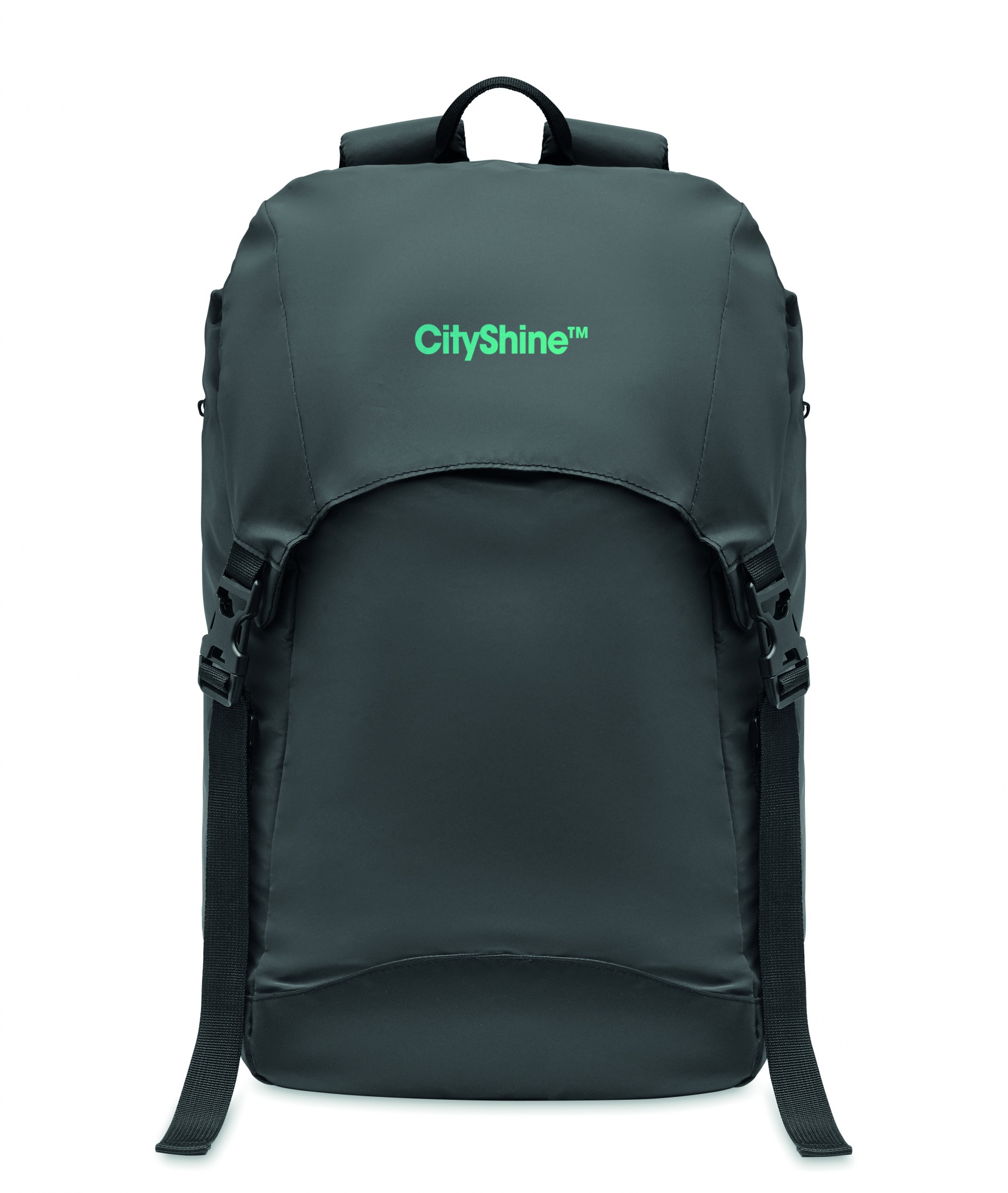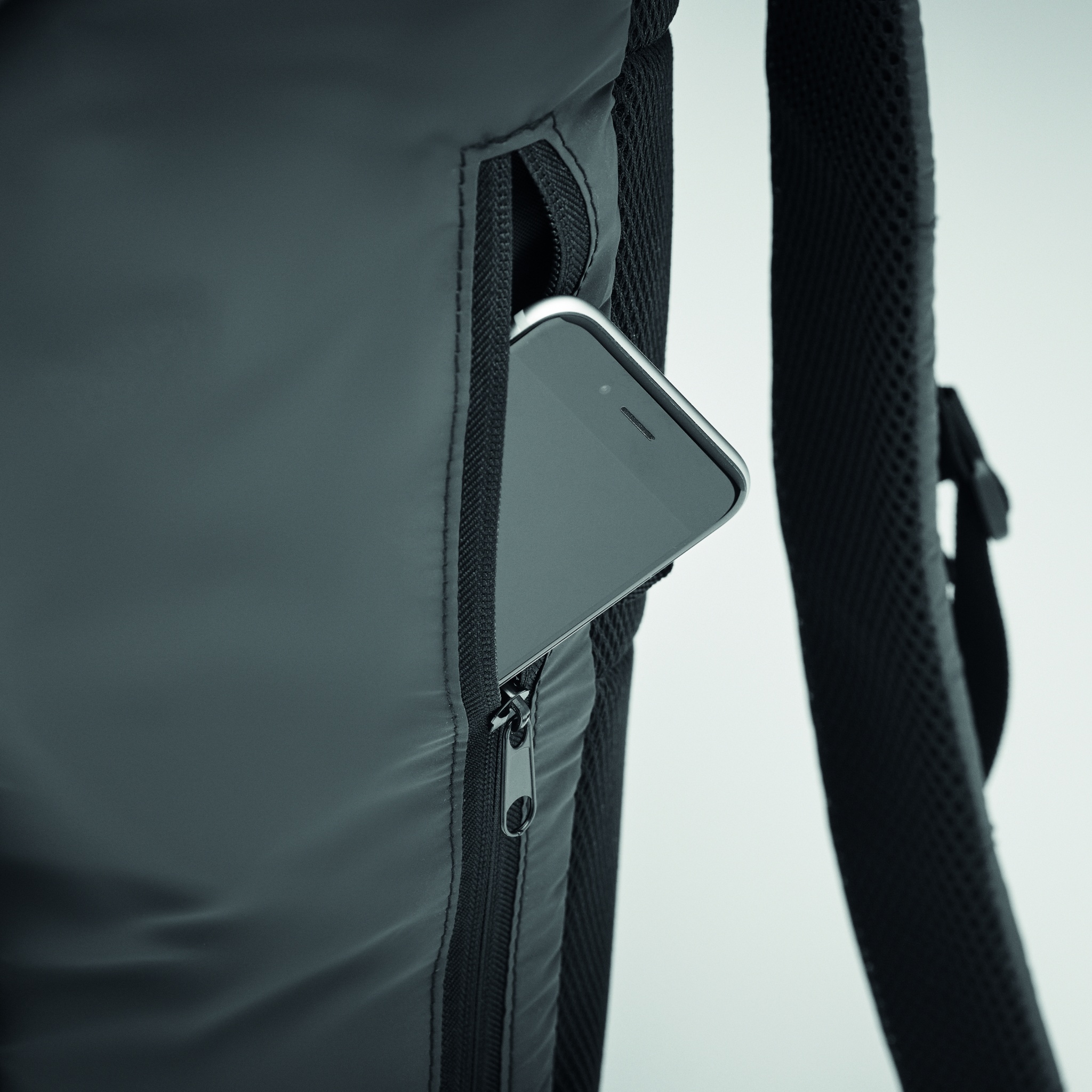 Ulkoilureppu 190T-polyesteristä jossa on kevyt heijastava pinta. Sivulla vetoketjullinen ulkotasku ja pehmustettu selkäosa, sisävuori, jossa vetoketju. Kannettavalle tietokoneelle pehmustettu lokero. Repussa on säädettävät ja pehmustettut kantohihnat sekä säädettävä rinta- ja vyötäröhihna solkisuljin. Vettä hylkivä.