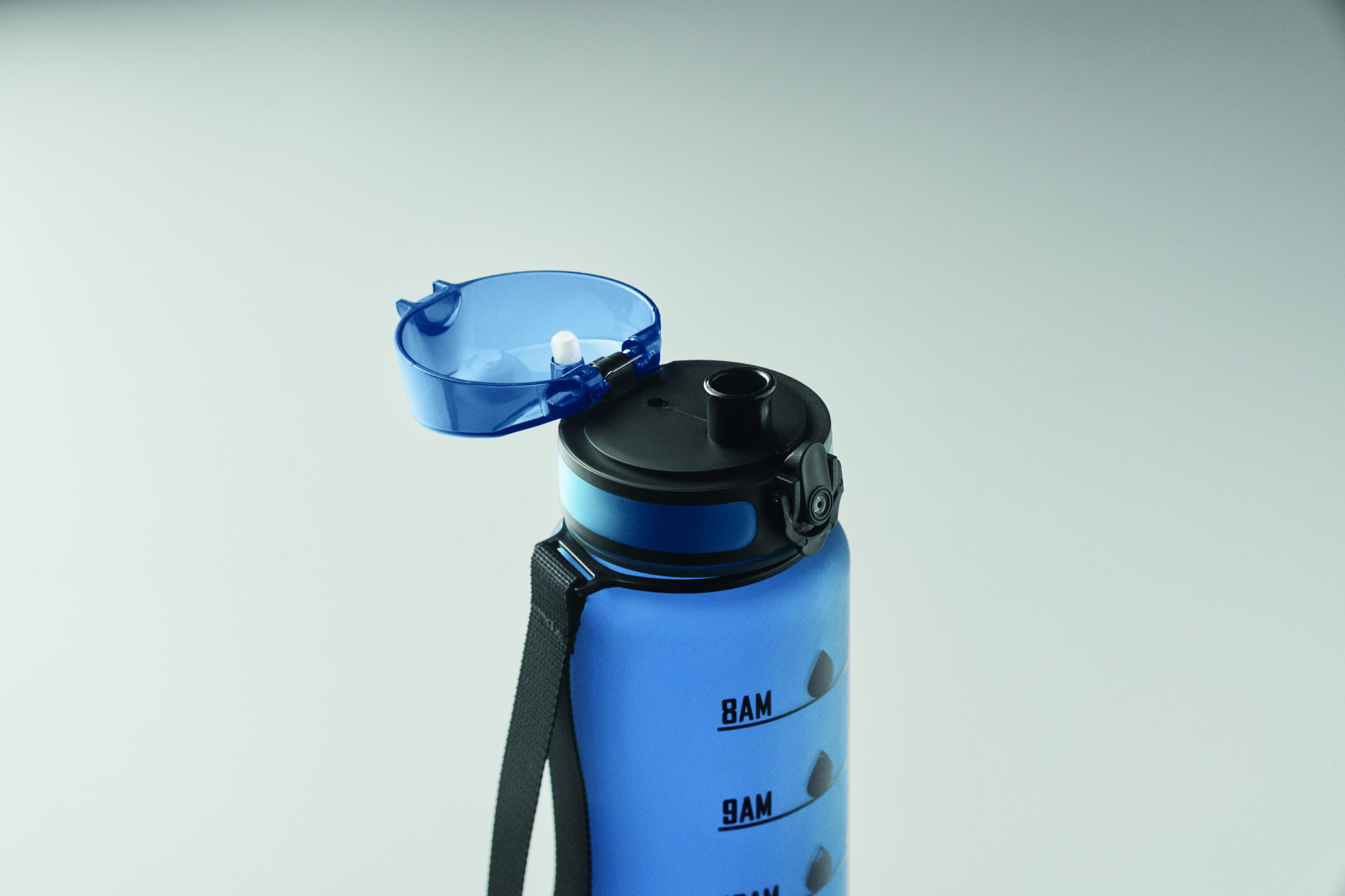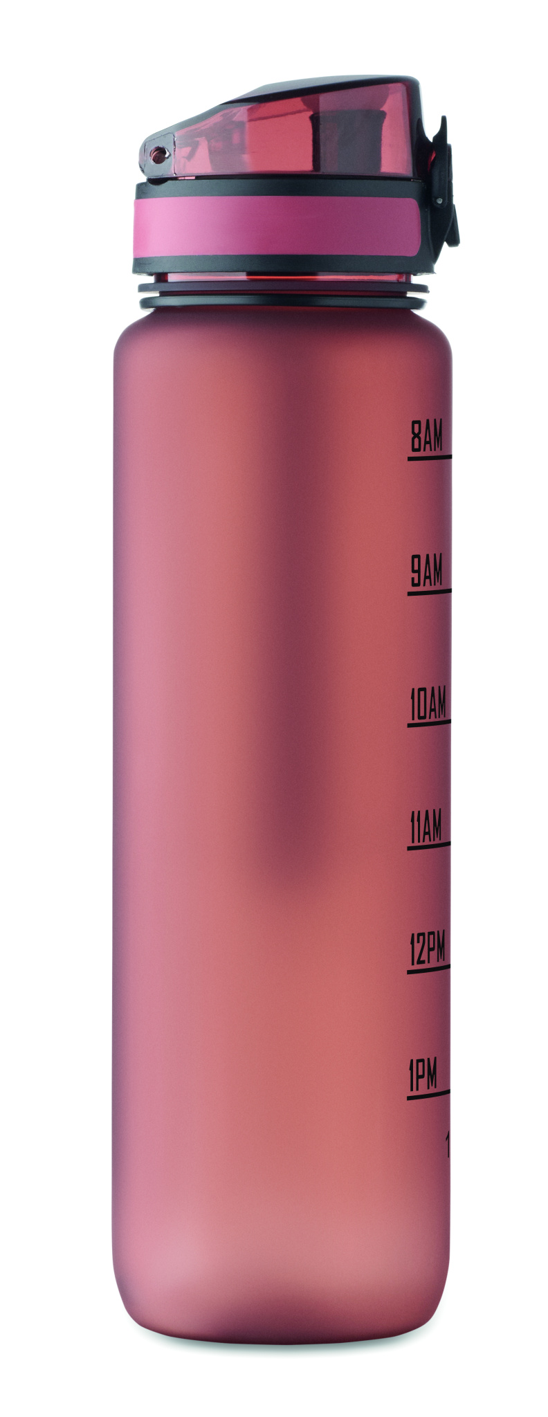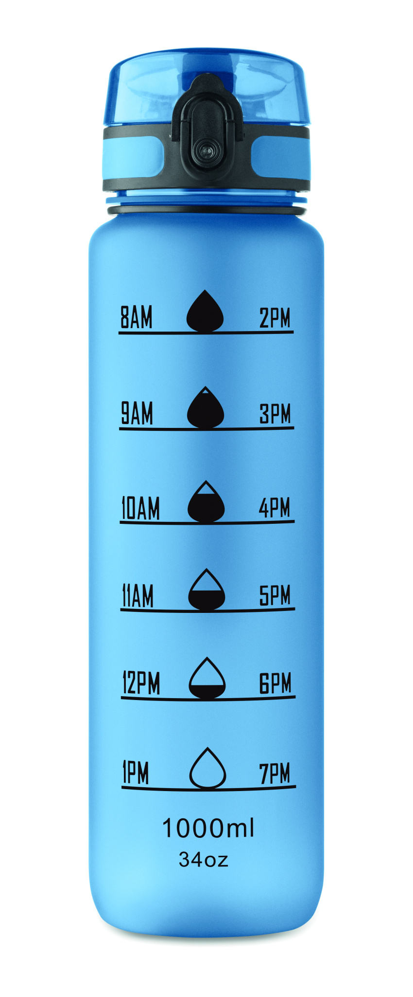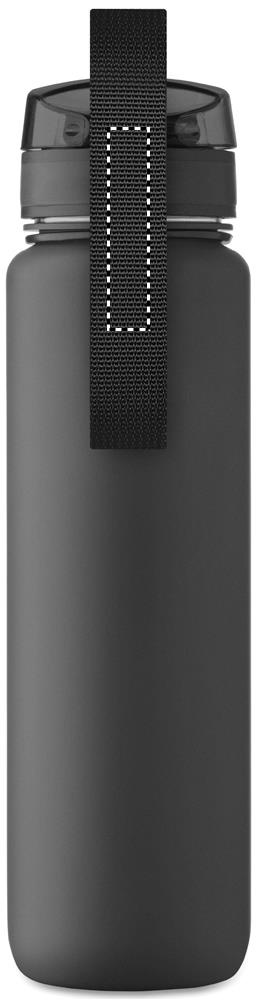 Urheilujuomapullo RPET-muovista, motivoivat aikamerkinnät, yhdellä kädellä avattava käännettävä kansi, turvalukko ja kantohihna. Vuotamaton. Tilavuus: 1 litra.
