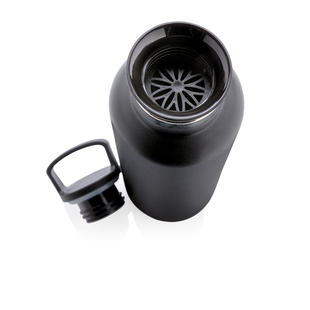 Jauhepinnoitettu, kaksiseinäinen termospullo. Suodattimellinen 2-in-1-kansi, täydellinen kuumalle teelle tai haudutettavalle vedelle. Standardisuu, joka sopii tavalliseen juomiseen ja jääpalojen lisäämiseen. Tehty kestämään, täydellinen pullo jokaiseen vuodenaikaan. 304 RST -sisäpuoli ja 201 RST -ulkopuoli pitää juoman kuumana 5 tuntia tai kylmänä 15 tuntia. Monissa eri väreissä. Luonnonvalkoisen värinen pullo on PMS-värissä Cool Grey 1. Sisältö: 600 ml.