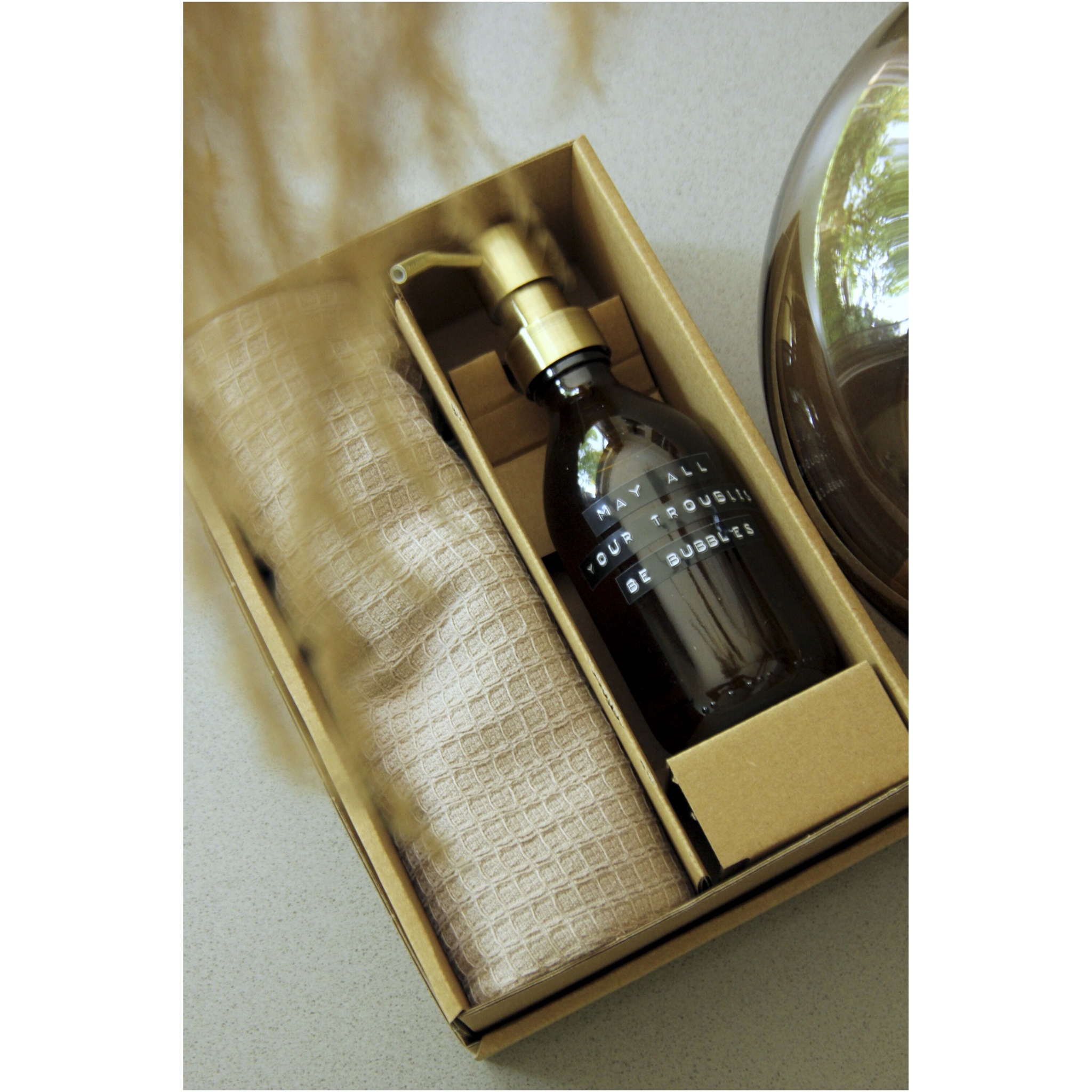 Lahjasetti sisältää 250 ml bambuntuoksuisen käsisaippuan ja luomupuuvillasta valmistetun beigen keittiöpyyhkeen. Tämä setti on täydellinen lahja jokaiseen tilaisuuteen.