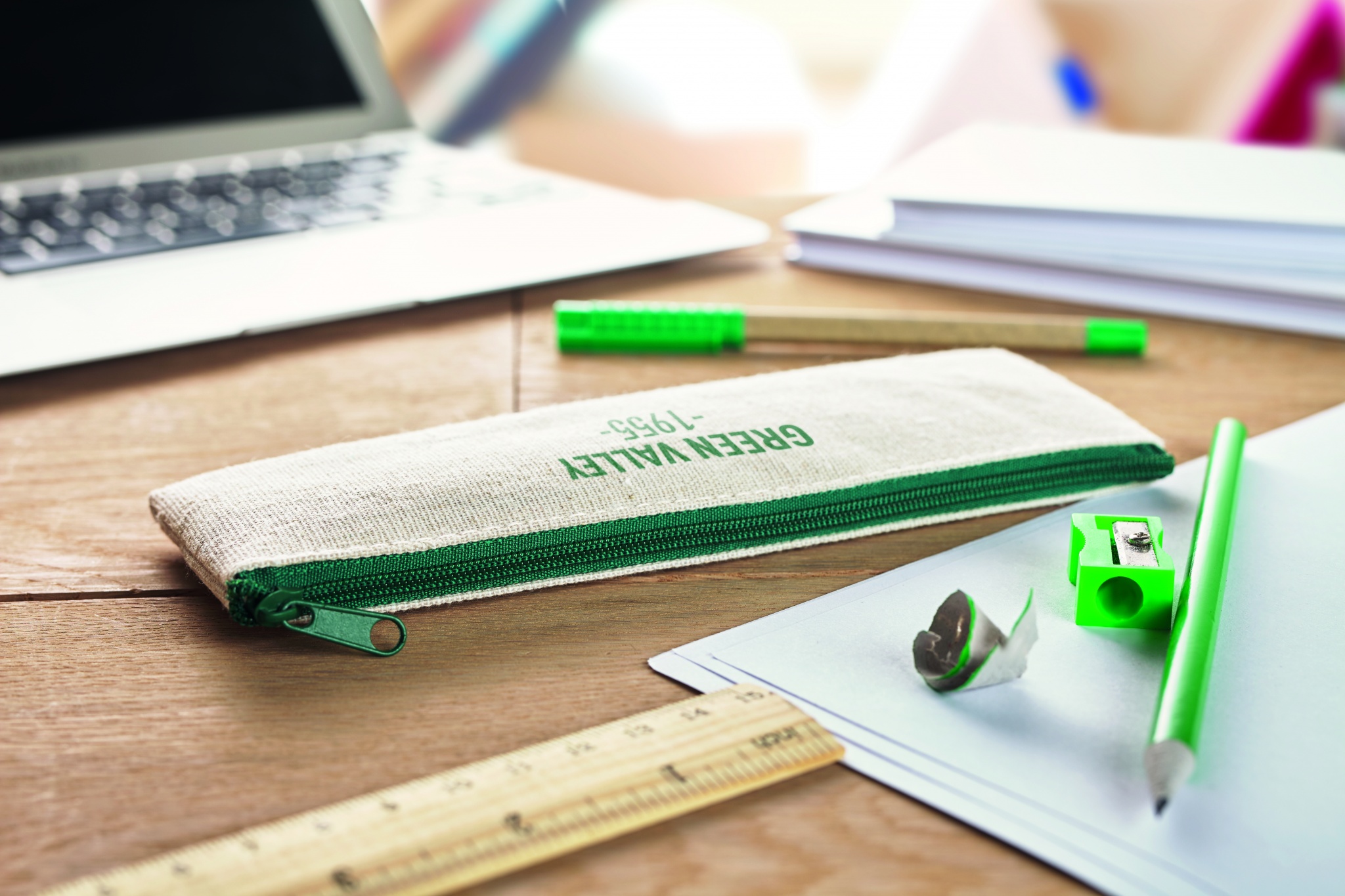 6 dalių stacionarus komplektas. Rinkinyje yra džiuto ir medvilnės dėklas, medinė liniuotė, plastikinis galąstuvas, trintukas, popierinis pieštukas ir tušinukas su mėlynu rašalu.