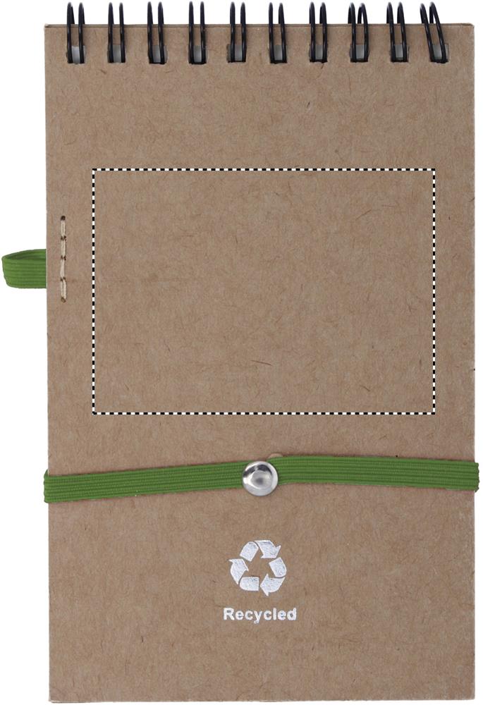 Perdirbto popieriaus sąsiuvinis su atitinkamu rašikliu. Dvigubas laidas. 140 paprasto perdirbto popieriaus puslapių (70 lapų). Atitinkamas mygtukų rašiklis perdirbtoje kartoninėje dėžutėje ir biologiškai skaidraus plastiko. Mėlynas rašalas. Elastinis užsegimo dirželis ir rašiklio laikiklis.