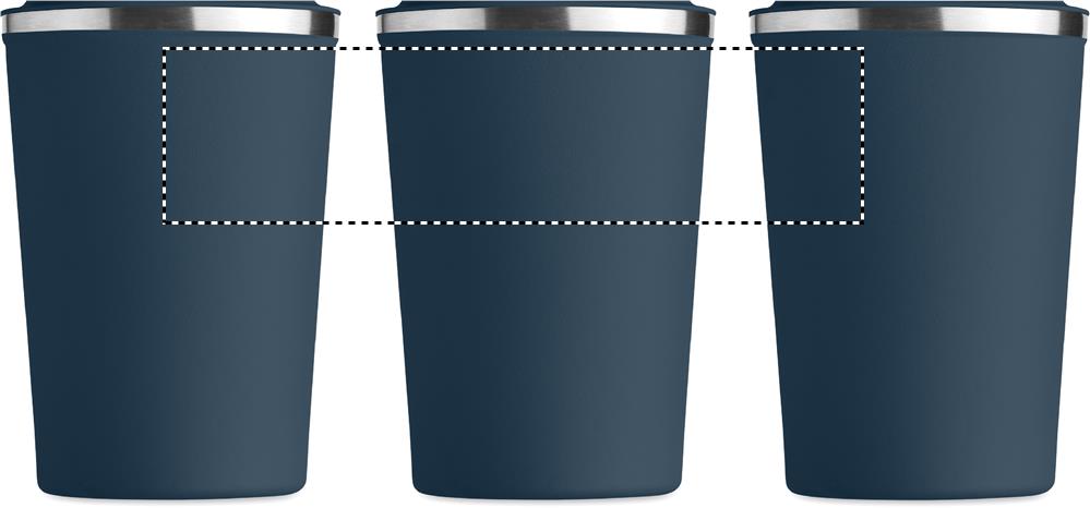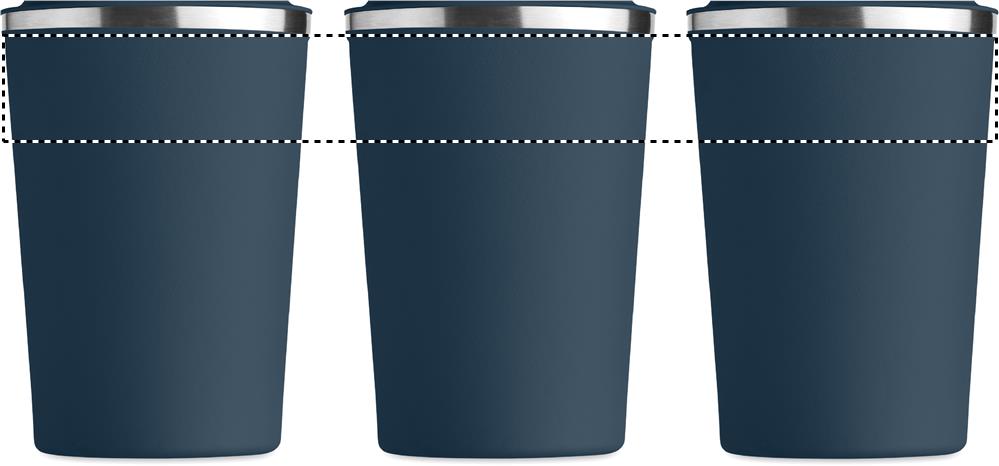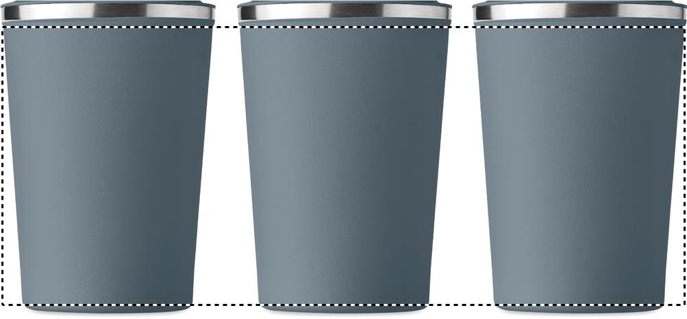 Dvigubos sienelės nerūdijančio plieno stiklinė su PP dangteliu. Talpa: 350 ml. Nesandarus.