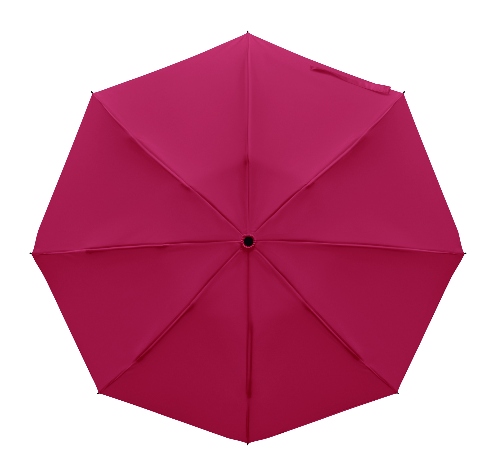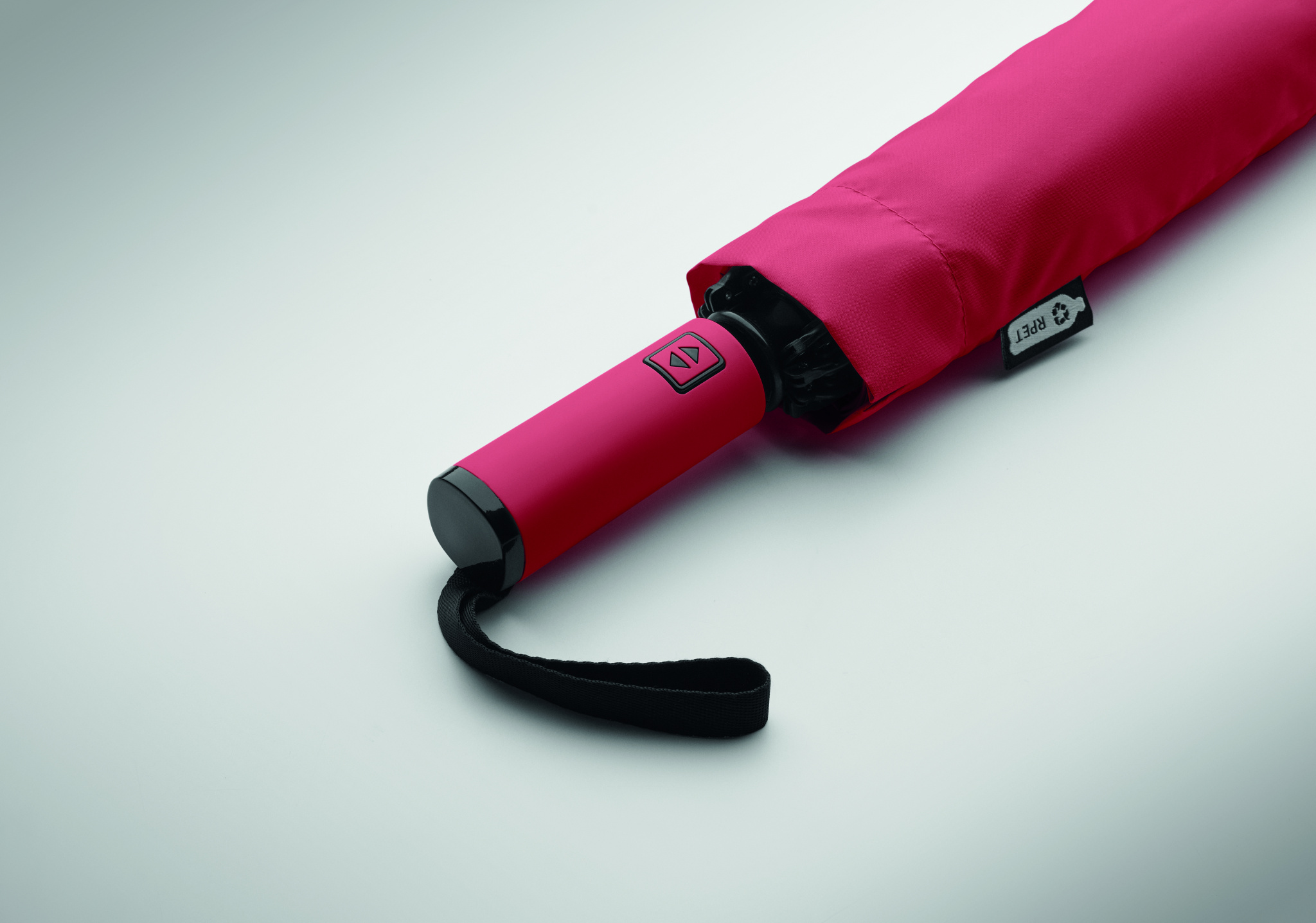 23-inch 3-fold reverse windproof umbrella made of 190T RPET pongee and matching pouch. Auto open and close, full black plating frame, fibreglass ribs, and a rubber-finished ABS handle.