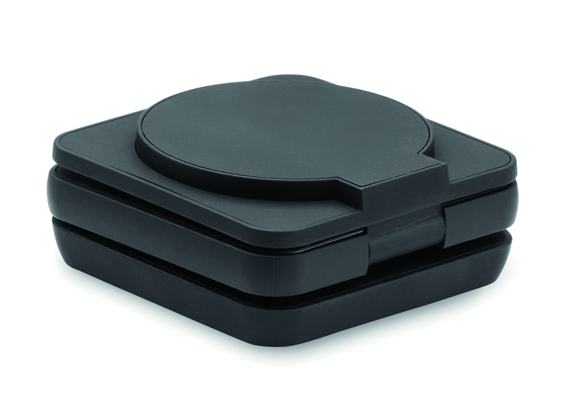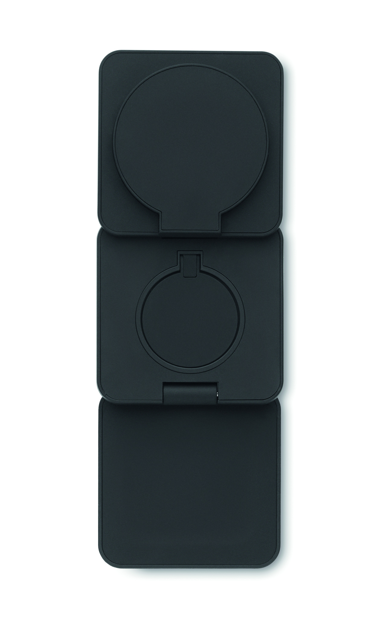 3 in 1 foldable charging station in rubberized recycled ABS. It includes a magnetic wireless charger 15W, smartwatch charger (Apple®only) and TWS charger.