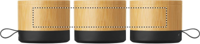 Wireless 5.1 speaker with bamboo casing and ABS base. Features 3W mono sound. Includes rechargeable and replaceable 500mAh battery. Compact and modern design.