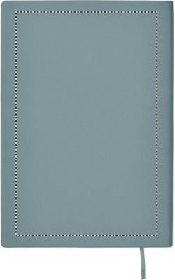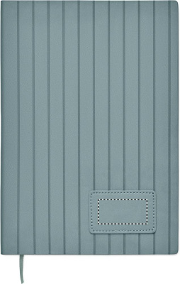 A5 notebook with soft smokey PU ribbed cover in 40% recycled post consumer and 60% PU with plain PU patch. 160 lined pages, 70gsm recycled paper (80 sheets). Matching colour polyester ribbon page marker.