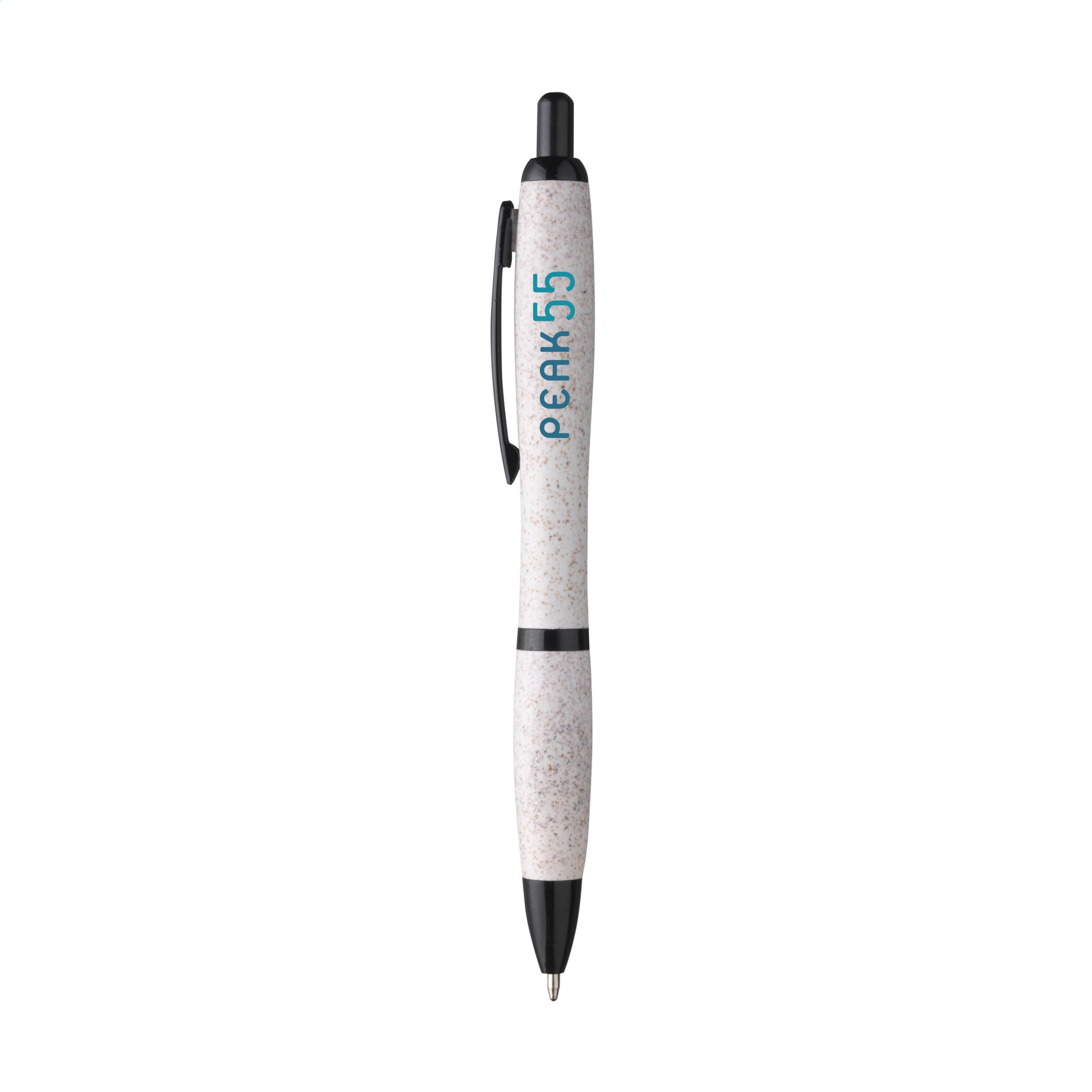 Шариковая ручка с синими чернилами, изготовленная из 50% полипропилена и 50% пшеничной соломы. С черными акцентами и металлическим зажимом. Частично биоразлагаемая.