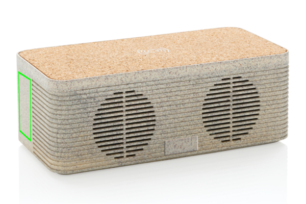 Этот гладкий на вид динамик для беспроводной зарядки из пшеничной соломы (35% пшеничного волокна, смешанного с АБС) и пробки позволяет вам совмещать прослушивание любимых мелодий с беспроводной зарядкой телефона. Просто подключите прилагаемый кабель Type C длиной 150 см к зарядному устройству дома или в офисе, и все готово. Он содержит беспроводной динамик мощностью 5 Вт и беспроводное зарядное устройство мощностью 5 Вт сверху с входным портом Type C и портом AUX. Динамик имеет аккумулятор емкостью 1200 мАч и BT 5.0, что обеспечивает время воспроизведения до 4 часов и рабочее расстояние до 10 метров. При использовании обеих функций убедитесь, что устройство подключено к источнику питания.
