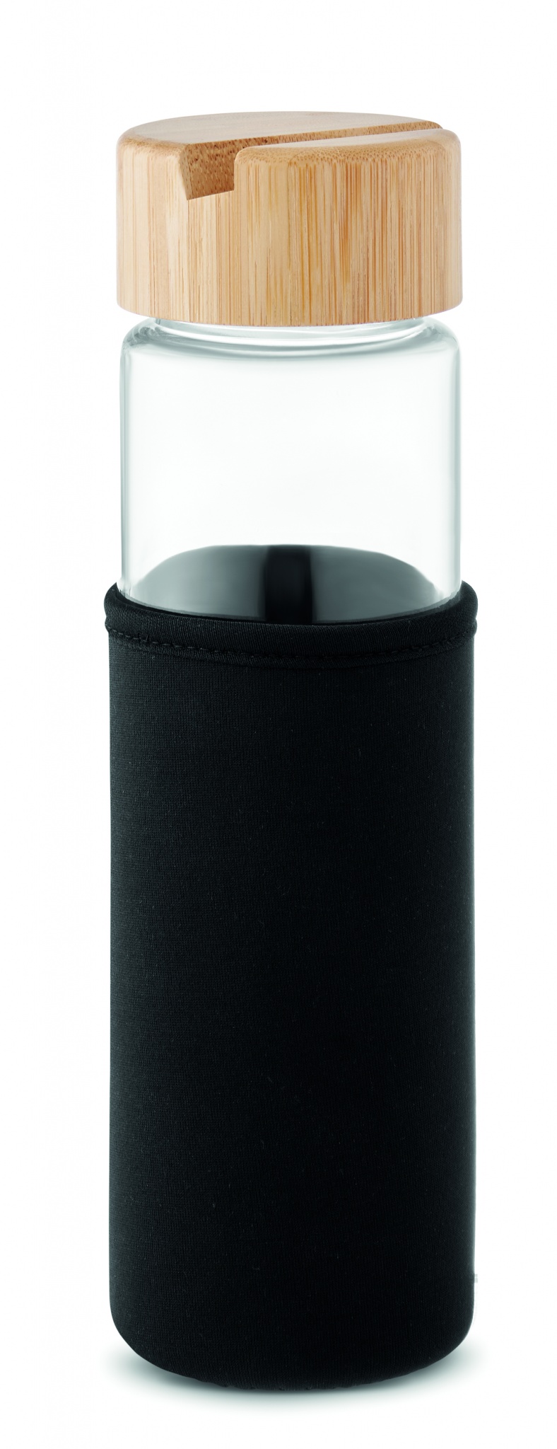 Стеклянная бутылка в неопреновом чехле с бамбуковой крышкой, которая также является подставкой для смартфона. Герметична. Емкость: 600 мл.
