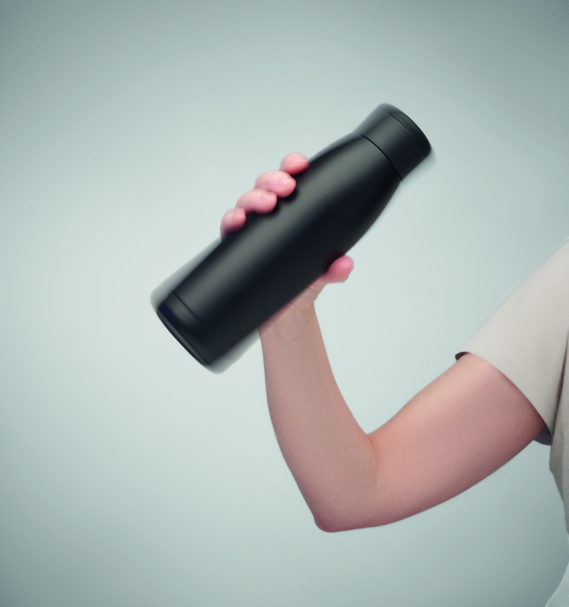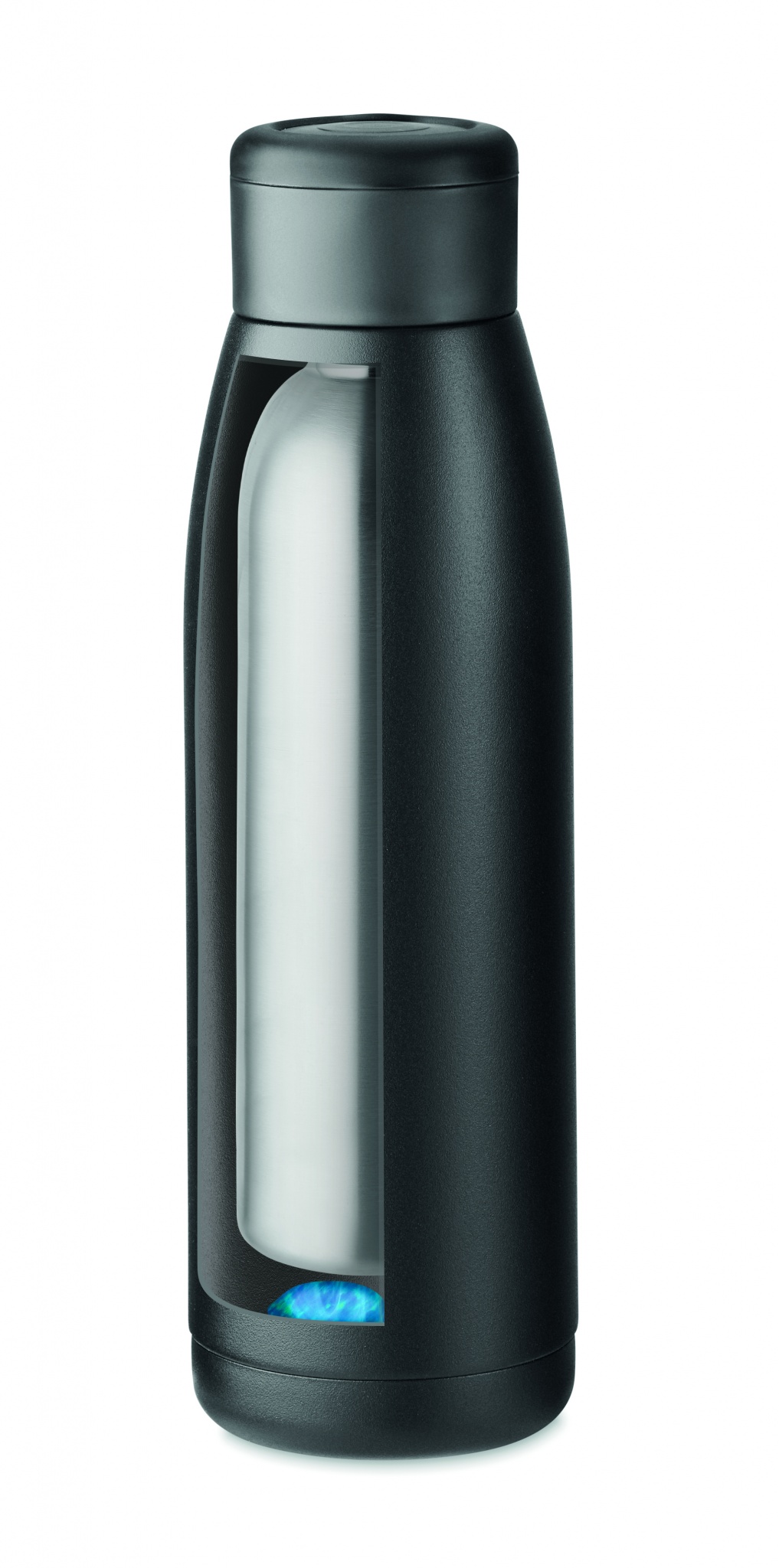 Бутылка с двойными стенками из переработанной нержавеющей стали (90%) и обычной нержавеющей стали (10%) и мягкой силиконовой крышкой с кольцом для переноски. При простом встряхивании бутылки температура меняется на нагрев или охлаждение, в зависимости от жидкости внутри. Герметична. Объем: 400 мл.