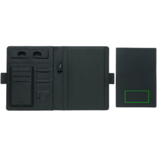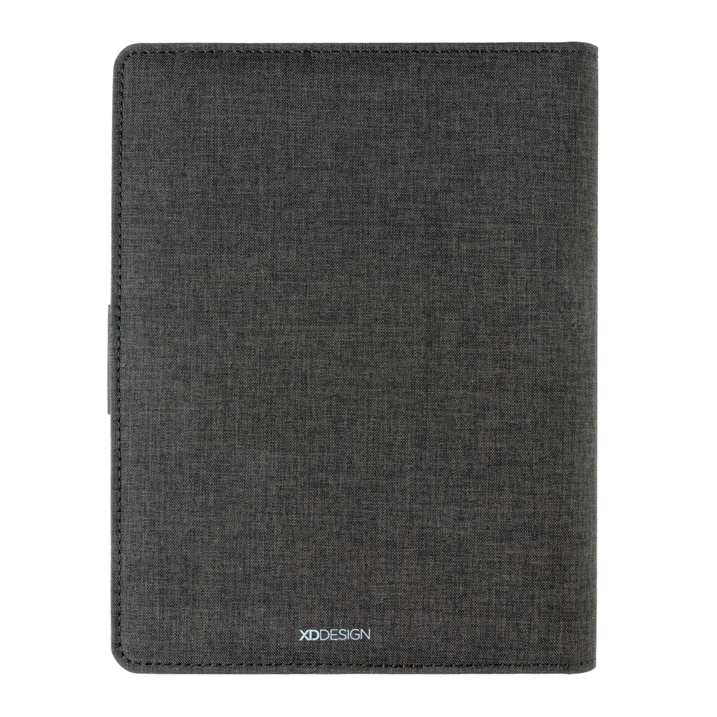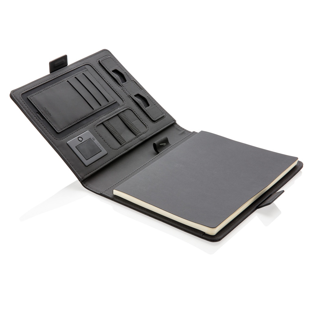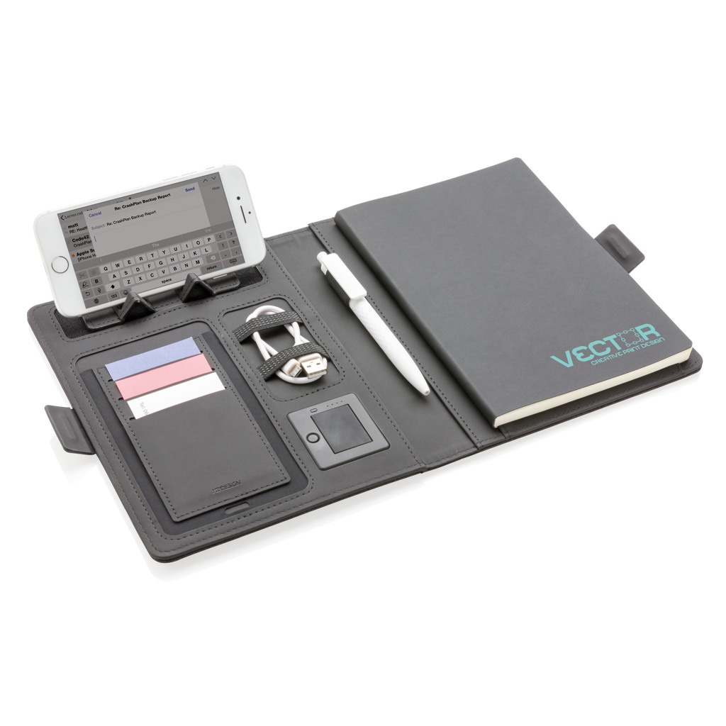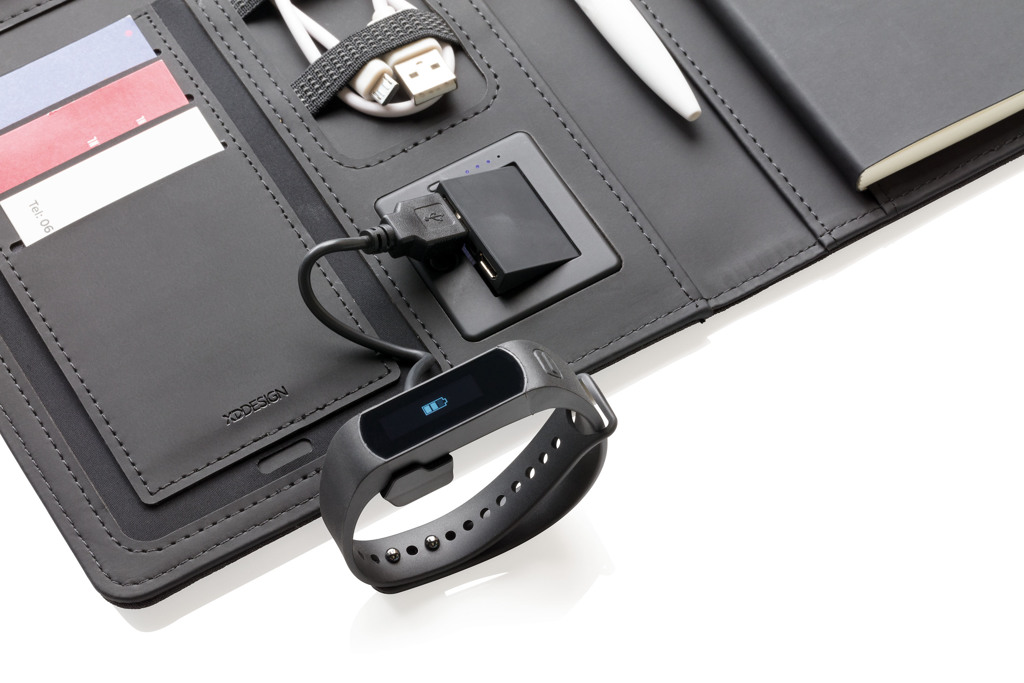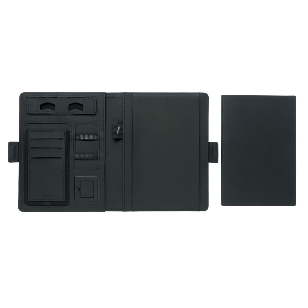 Эта обложка для ноутбука со съемным блокнотом (128 линованных страниц плотностью 80 г/м²) может похвастаться новейшими технологиями. Передняя обложка имеет беспроводную зарядную панель для вашего телефона. (Android последних поколений, iPhone 8 и выше). Старые телефоны и планшеты можно заряжать через порты USB от внешнего аккумулятора емкостью 4000 мА·ч. Уникальные порты USB выдвигаются простым нажатием кнопки. Вход: 5,0 В/1,0 А. Выход: 5,0 В/2,1 А. Беспроводной выход: 5 Вт. Зарегистрированный дизайн®