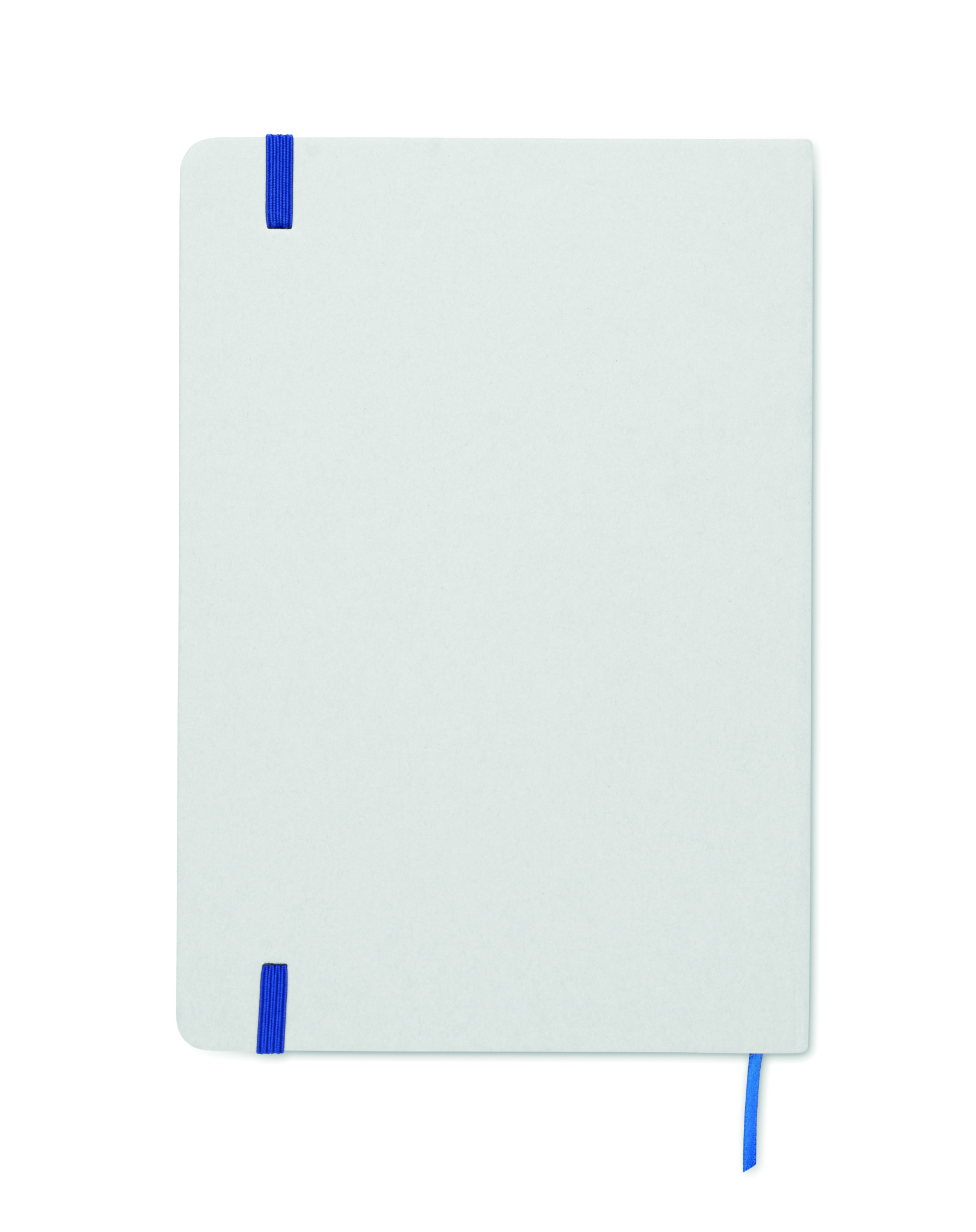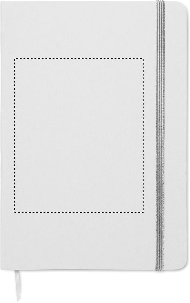 A5 notebook with hard recycled carton cover. White cover. Casebound. 160 lined recycled paper pages (80 sheets). Elastic closure strap, ribbon bookmark matching with revealed colour. After laser engraving the colour is revealed.