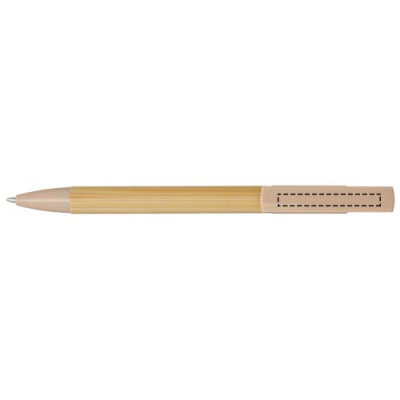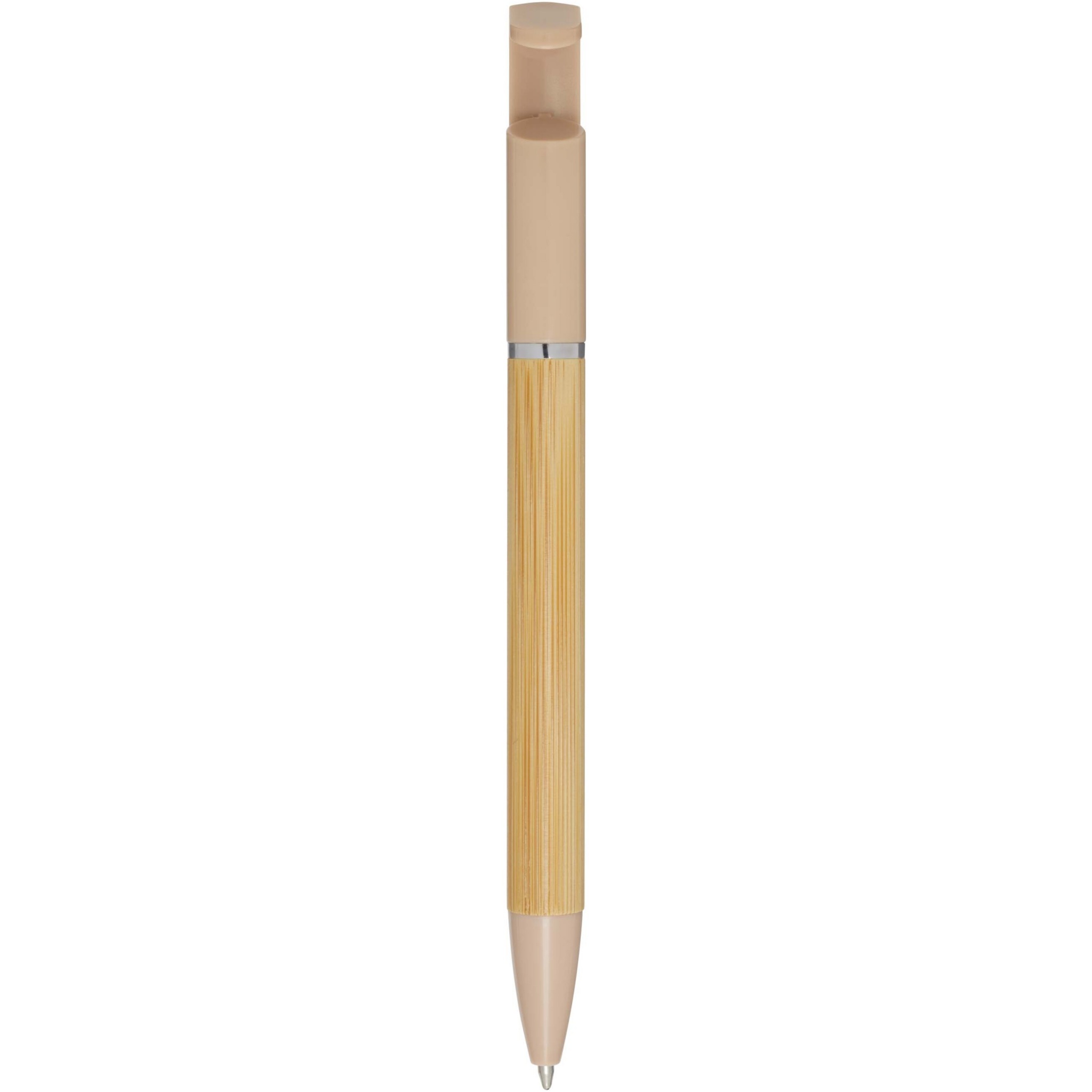 Бамбуковая шариковая ручка, которая также может служить подставкой для телефона. Кнопка и среднее кольцо изготовлены из переработанного пластика, наконечник — из латуни, а корпус — из бамбука, полученного из ответственных источников. Цвет чернил: синий. Длина непрерывной линии: 1000 метров. Размер пера: 1,0 мм.