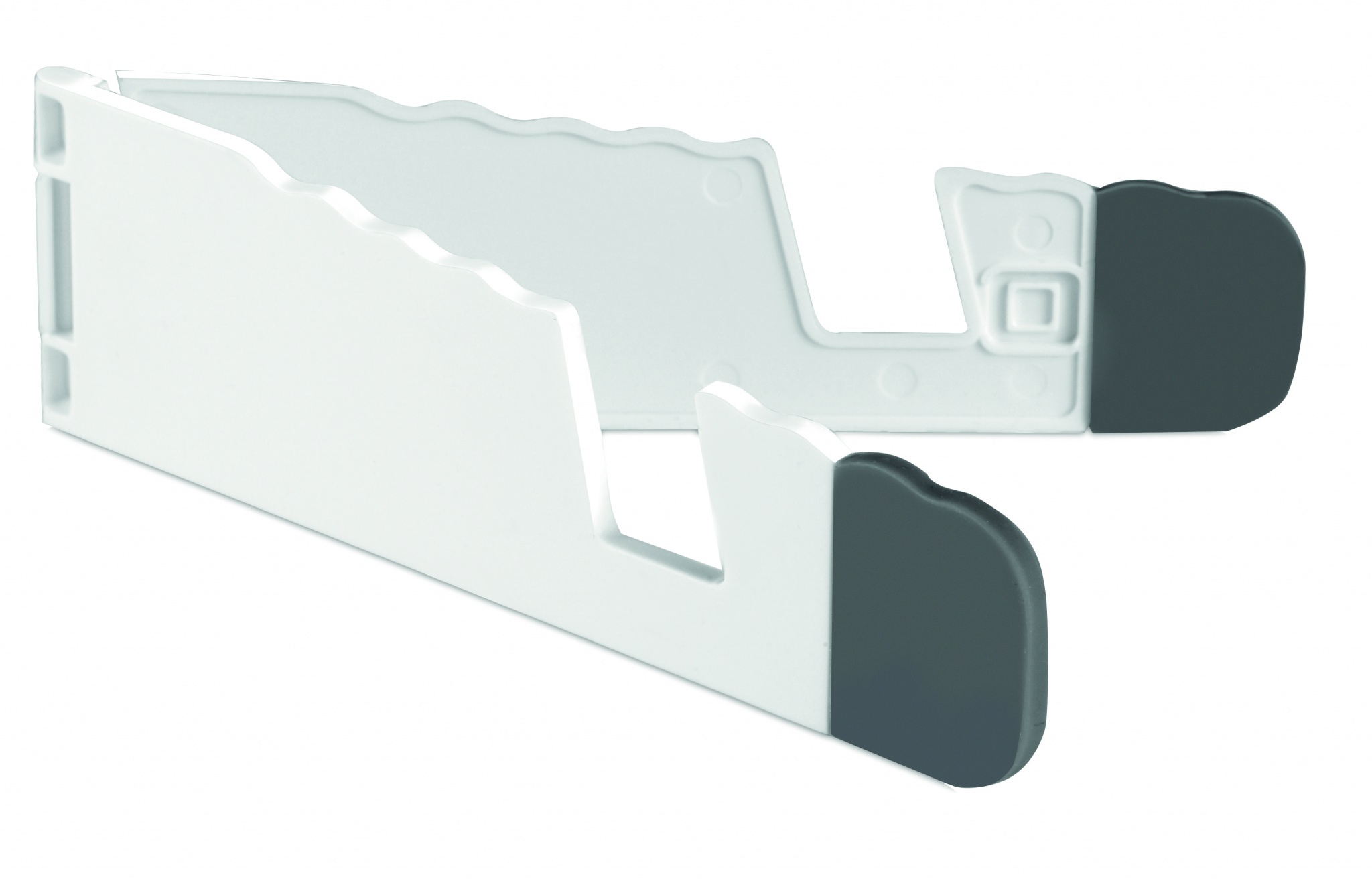 Складной держатель для планшета или смартфона из белого пластика. Края из серого силикона.