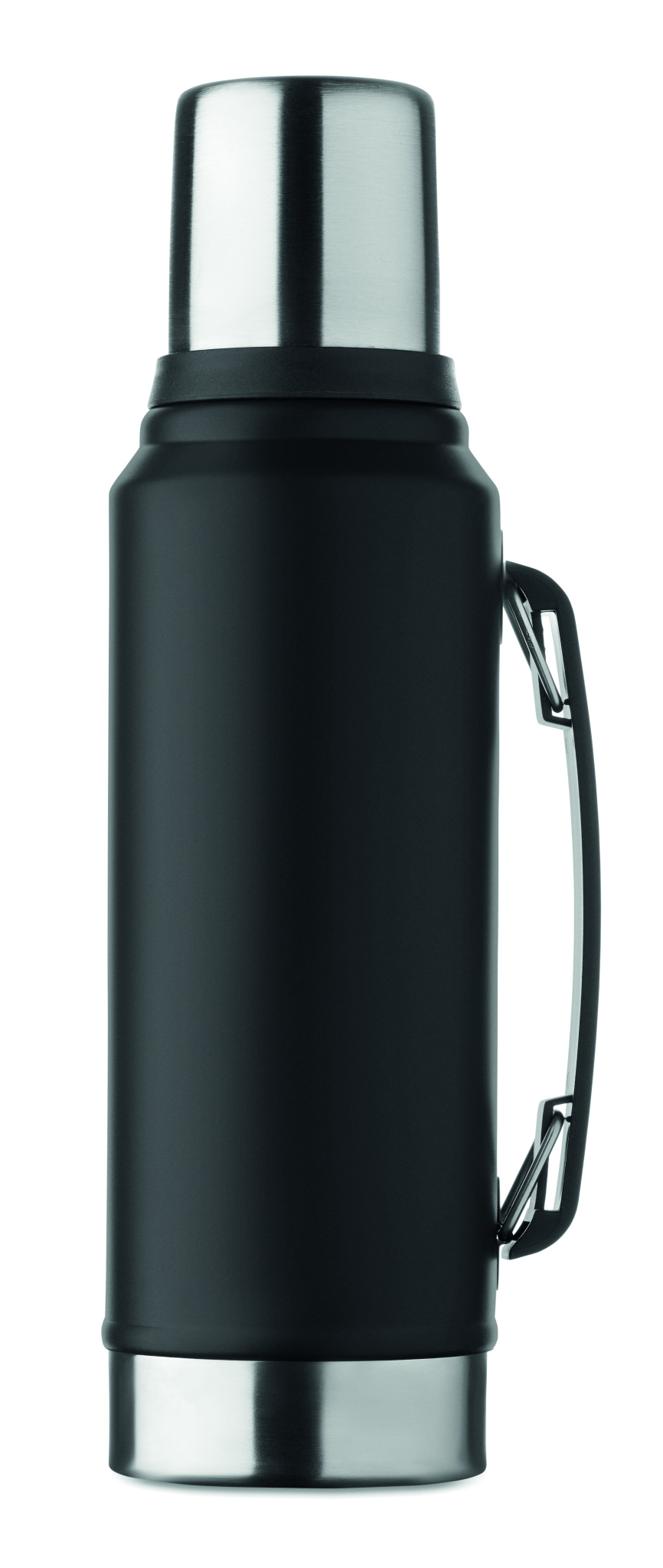 Double wall vacuum insulating bottle in recycled stainless steel (90% recycled stainless steel and 10% stainless steel) with handle on side. With PP lid and recycled stainless steel cup. Leak-free. Capacity: 1L.