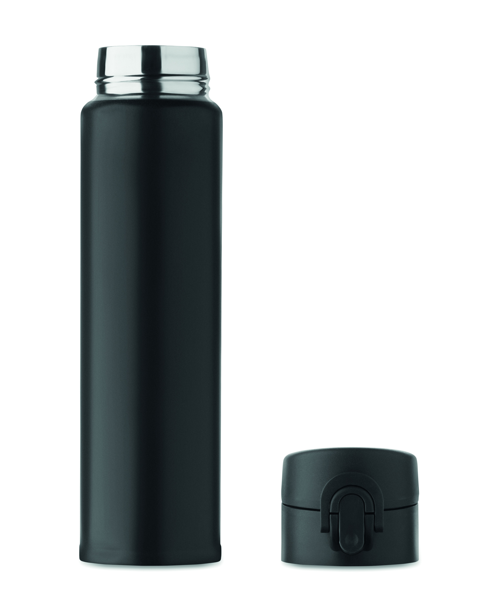 Double wall drinking bottle in recycled stainless steel (90% recycled stainless steel and 10% stainless steel) with security lock on the lid and press-to-open option. Leak free. Capacity: 300ml.