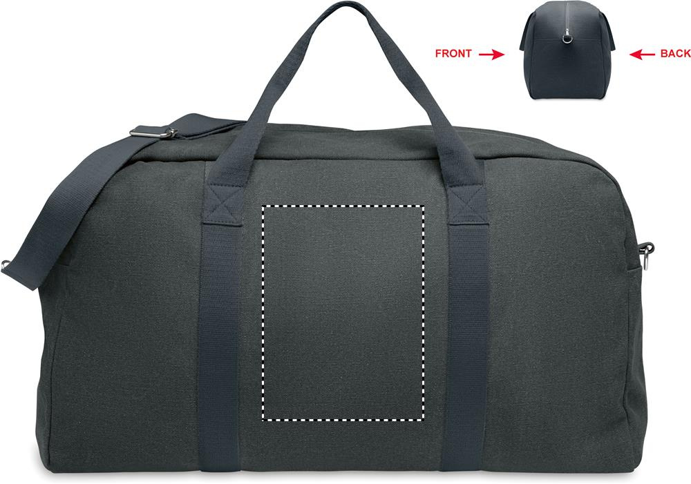 Duffle travel bag in recycled 450 gr/m² fabrics (60% recycled cotton and 40% recycled polyester) with adjustable and detachable cotton strap.