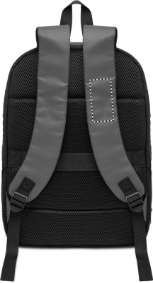 Expandable 600D RPET polyester computer backpack 16'' with PU coating on front and RPET polyester lining. Hidden zippered pocket and padded laptop compartment, front compartment, mesh back and luggage strap.