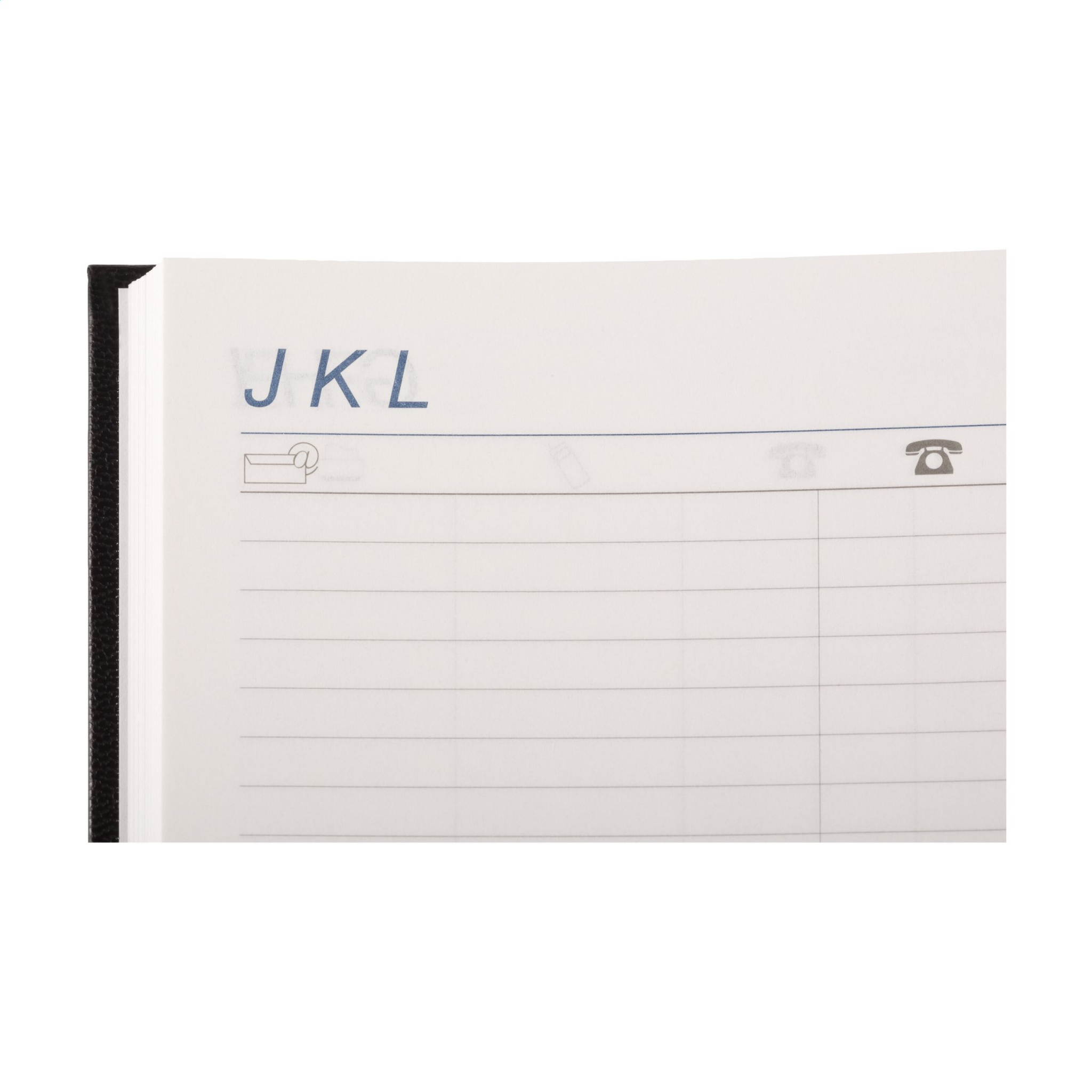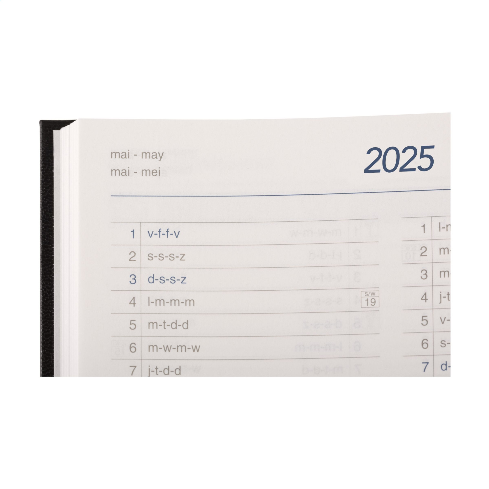 Офисный ежедневник на четырех языках: EN, NL, F и D. С прочной мягкой обложкой Balacron и тисненым годом на лицевой стороне. Белая бумага плотностью 80 г, сертифицированная FSC Mix, большой еженедельный обзор на двух страницах, двухцветная печать, переплет на нитках, еженедельный обзор на двух страницах, ежедневник на текущий год и следующий год, дополнительная полезная информация. Размер близко к A5.