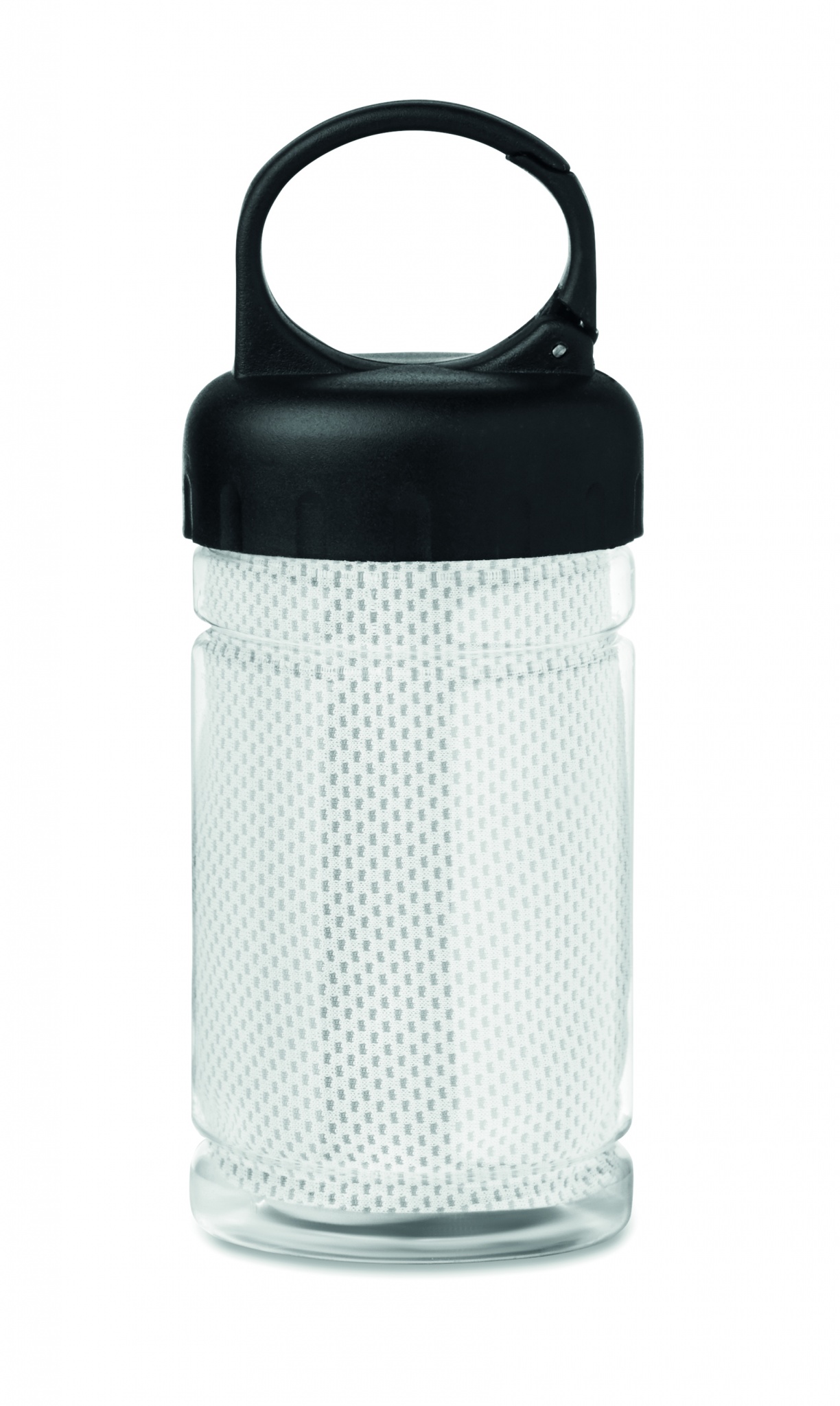 Фляга для питья пластиковая в мини-формате на карабине и с полотенцем внутри.