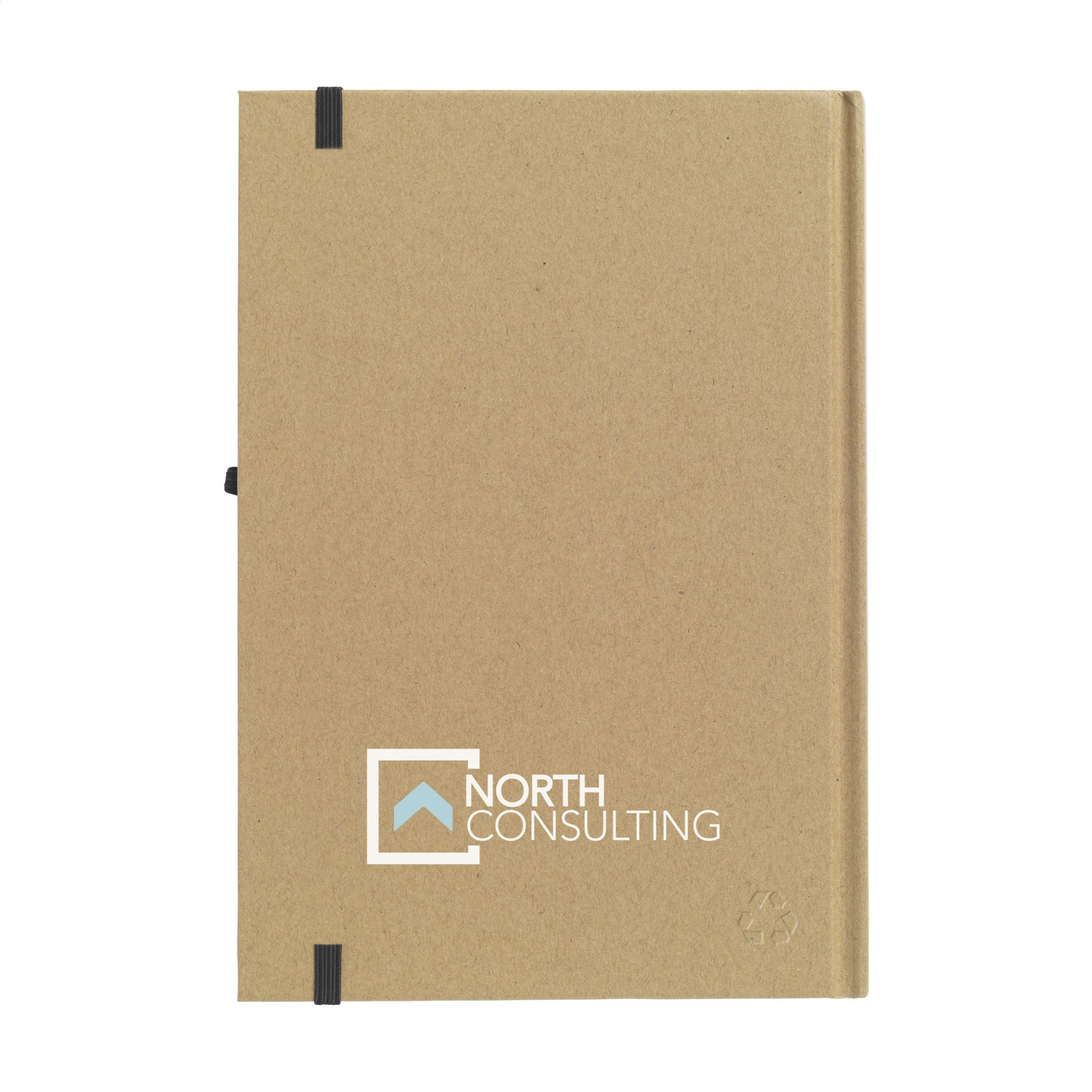 Блокнот формата А5 из переработанного материала. Примерно 80 листов/160 страниц кремовой линованной бумаги (70 г/м²), удобная петля для ручки и эластичная застежка.