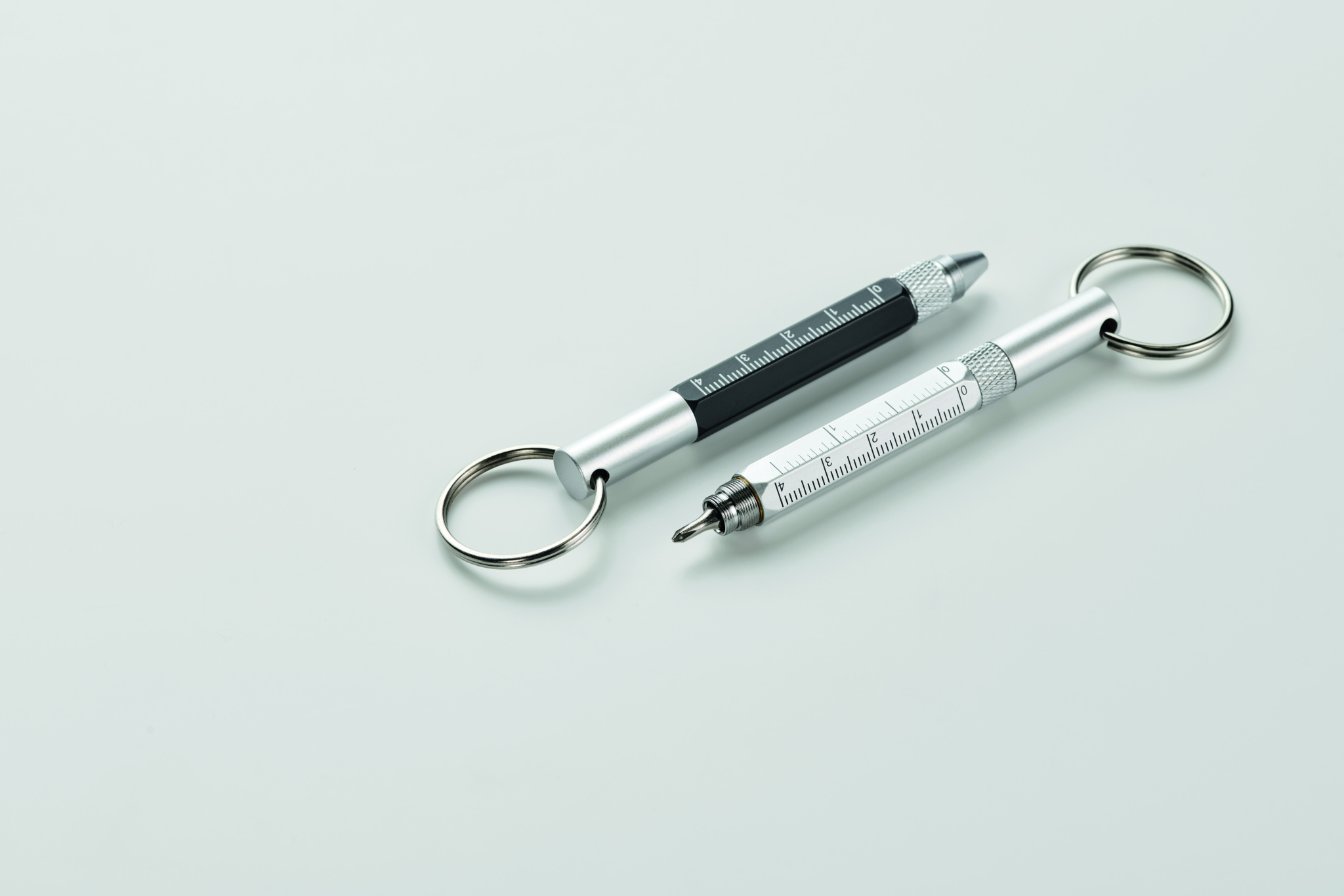 Key ring with twist action pen in recycled aluminium with 4cm/ 1,5 inch ruler, stylus and 2 in 1 phillips and flat head screw driver. Black ink.