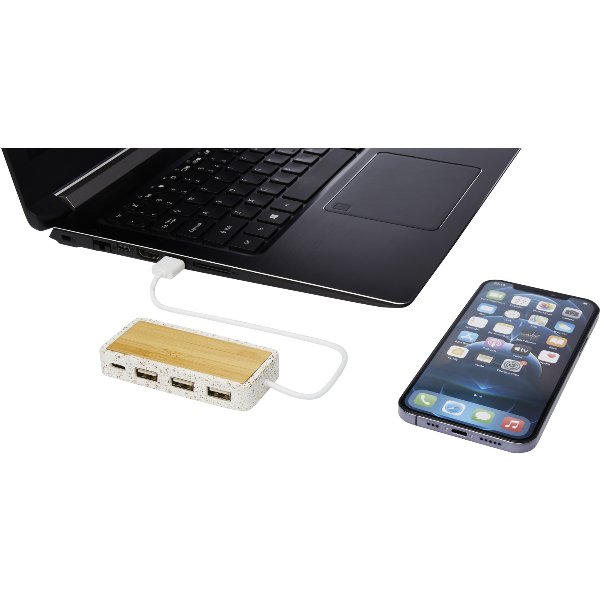 Концентратор USB 2.0, изготовленный из сочетания натурального терраццо и бамбука. Включает 1 выход Type-C и 3 выхода USB-A. Поставляется в подарочной коробке и с инструкцией по эксплуатации (изготовленных из экологичных материалов).