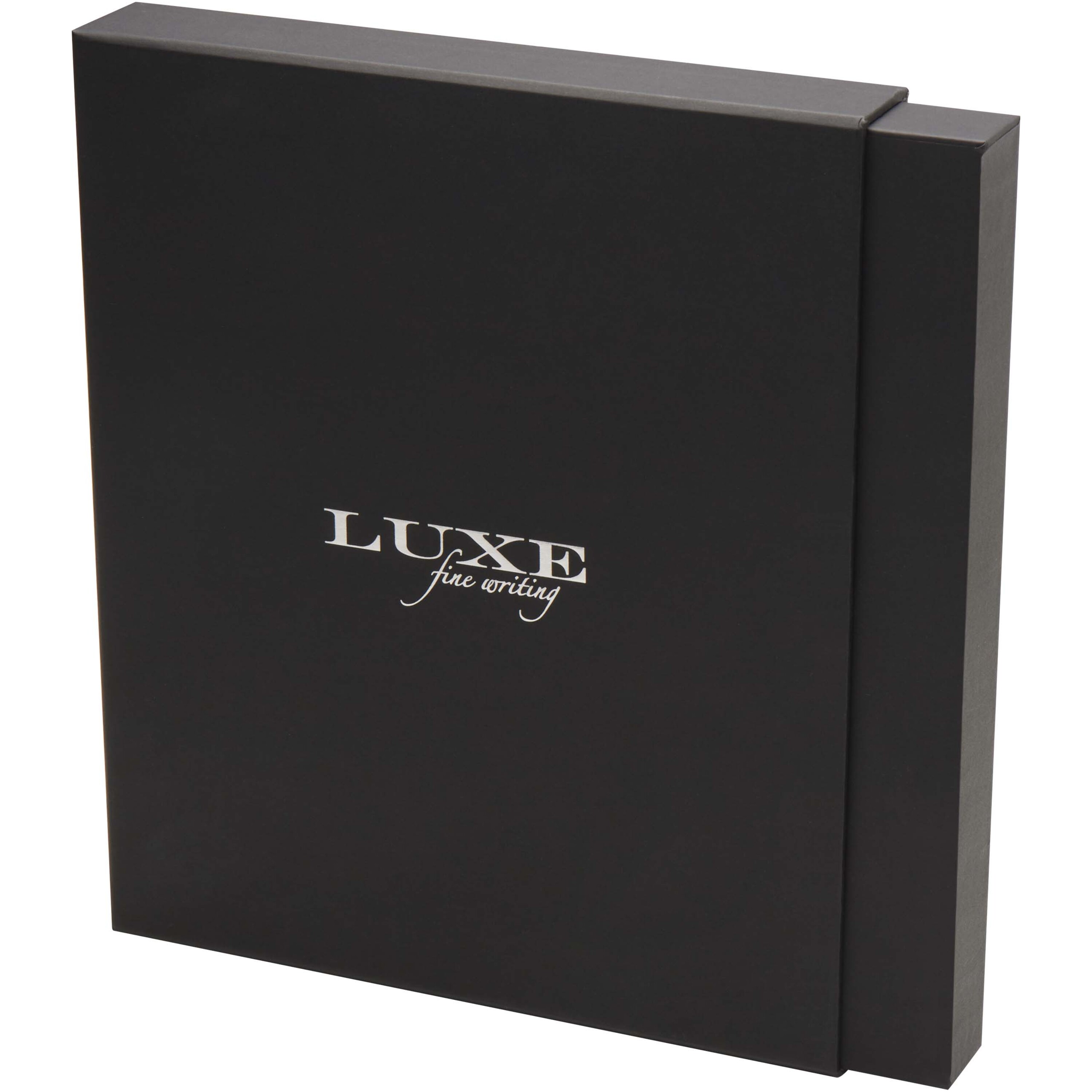 Legato — это элегантное сочетание блокнота формата А5 и ручки-роллера. Ручка имеет верхний корпус из переработанной латуни с золотым хромированием, нижний корпус с черно-коричневым напылением, металлические хромированные аксессуары из золота и логотип LUXE на среднем кольце. Цвет чернил: черный. Длина непрерывной линии: 400 метров. Размер пера: 0,7 мм. В блокноте 80 листов разлинованной бумаги плотностью 80 г/м², обложка из переработанного пластика, эластичная застежка, закладка-лента и карман-гармошка. Металлический аксессуар из хромированного золота на эластичной застежке. Поставляется в подарочной коробке из переработанного картона.