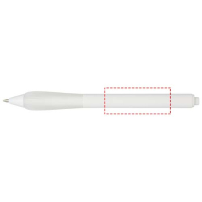 Шариковая ручка из переработанного пластика с прорезиненным корпусом и рукояткой из TPR. Цвет чернил: синий. Длина непрерывной линии: 1000 метров. Размер пера: 1,0 мм.