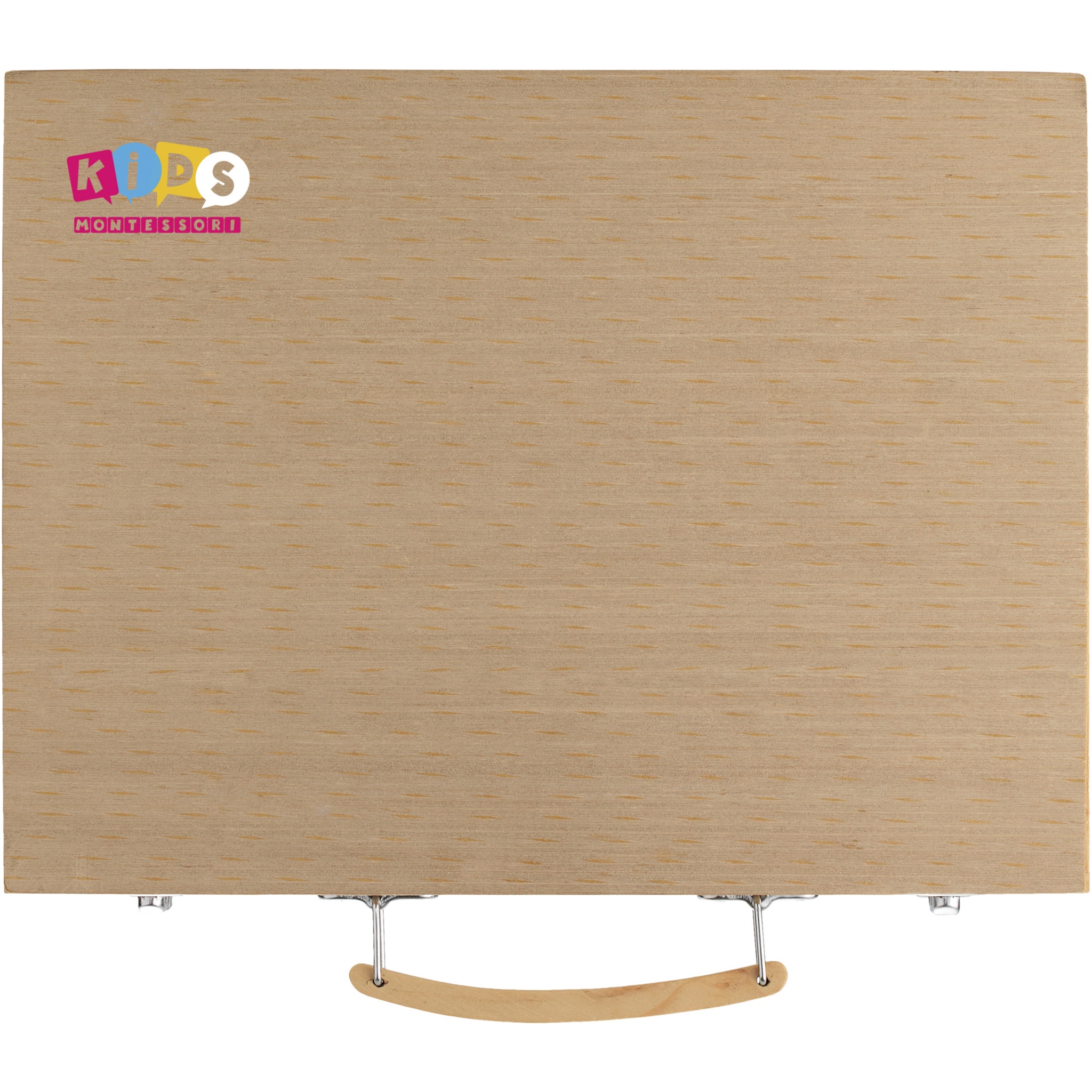 Набор включает 12 акварельных красок, 12 цветных карандашей, 12 цветных ручек, 12 масляных пастелей, 12 фломастеров, 12 мелков, клей, резинку, точилку, карандаш HB и кисточку в деревянной коробке. Нанесение не предлагается на отдельные элементы набора.
