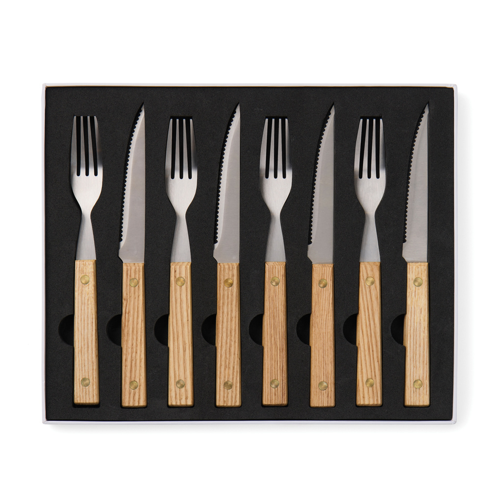 Накройте стол этим вневременным набором из 8 столовых приборов для барбекю, разработанным с учетом скандинавской простоты. Изготовленный из сертифицированного FSC® ясеня и высококачественной нержавеющей стали, этот набор включает четыре острых ножа и четыре вилки с удобными ручками. Этот набор не только приятно использовать, но и стильно дополнить любое барбекю или обед.