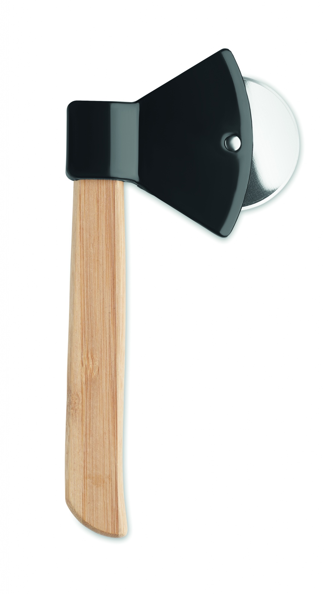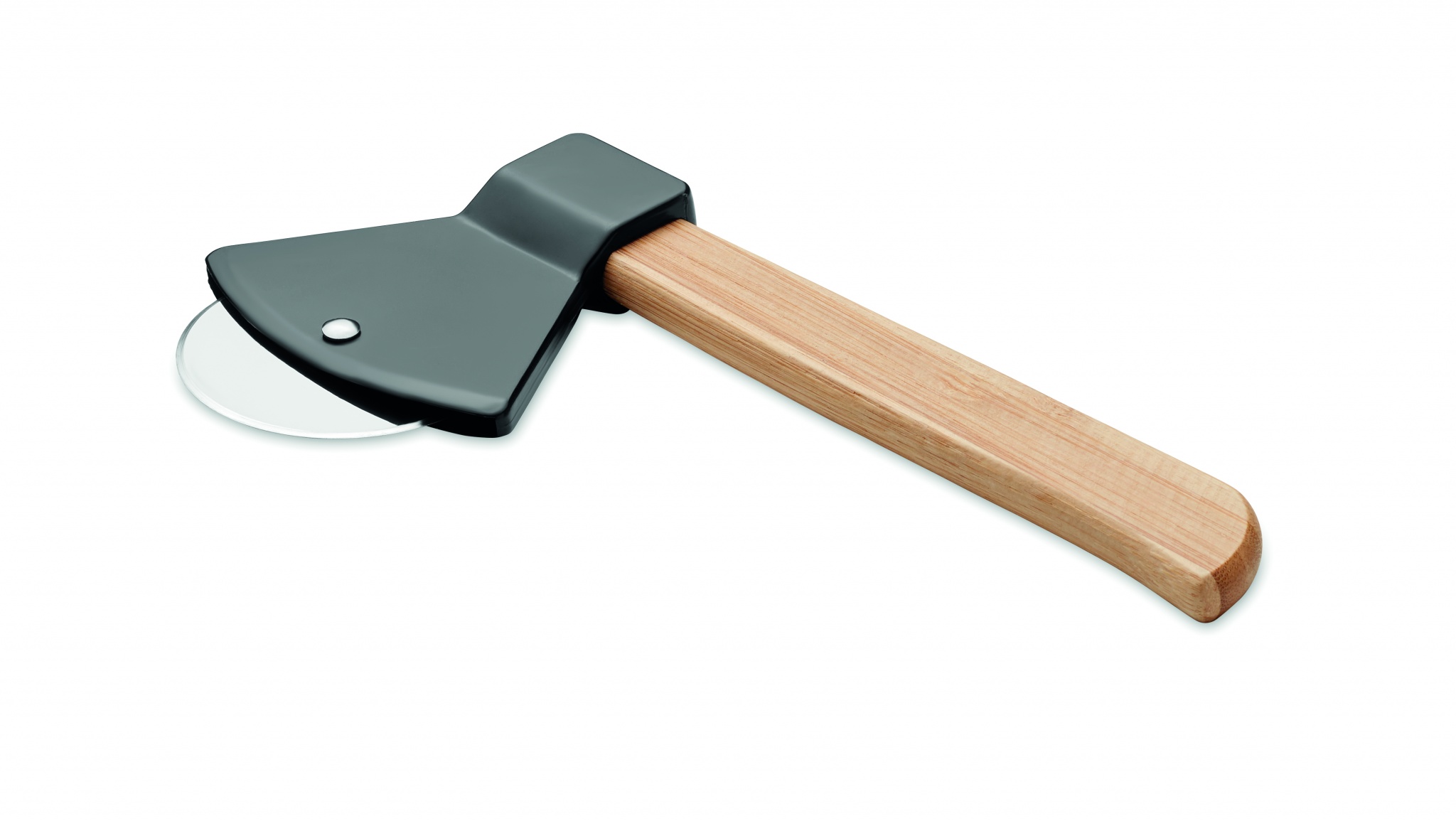 Нож для пиццы в форме топора с бамбуковой ручкой.
