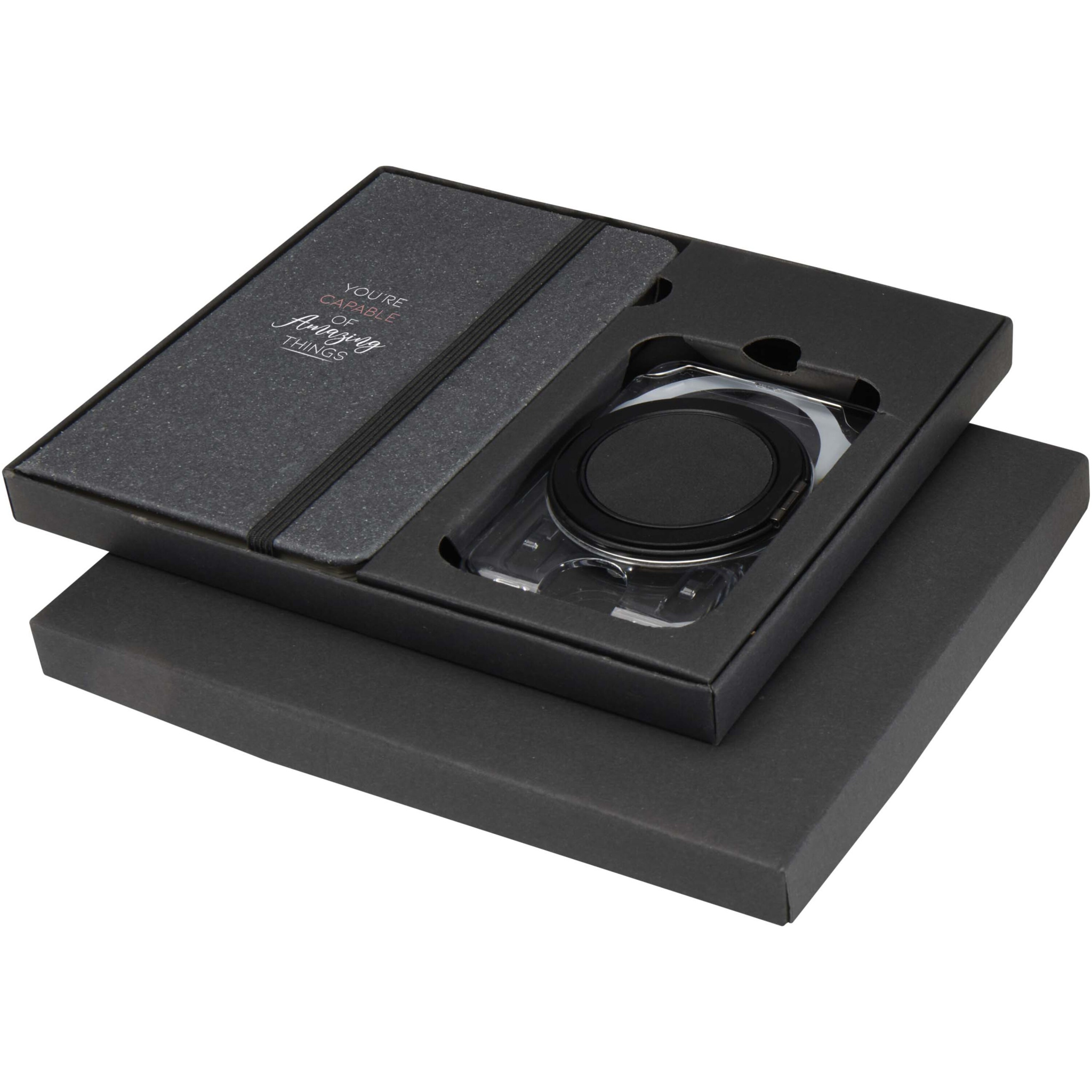 Практичный подарочный набор, включающий блокнот формата А6 и кошелек MagSafe. Блокнот имеет темно-серую обложку из переработанной пластмассы, 80 линованных листов кремового цвета плотностью 70 г/м² и черную эластичную застежку. Прозрачный кошелек MagSafe вмещает одну карту и крепится магнитом к iPhone 12 или более новым моделям, а также поставляется с дополнительным металлическим кольцом для использования с другими телефонами. Оба изделия упакованы в элегантную подарочную коробку из черного картона.