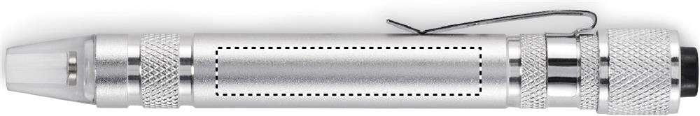 Recycled aluminium multi tool in pen shape with torch. Includes 3 slotted and 3 Phillips screwdriver heads. 4 button cell LR41 batteries included.