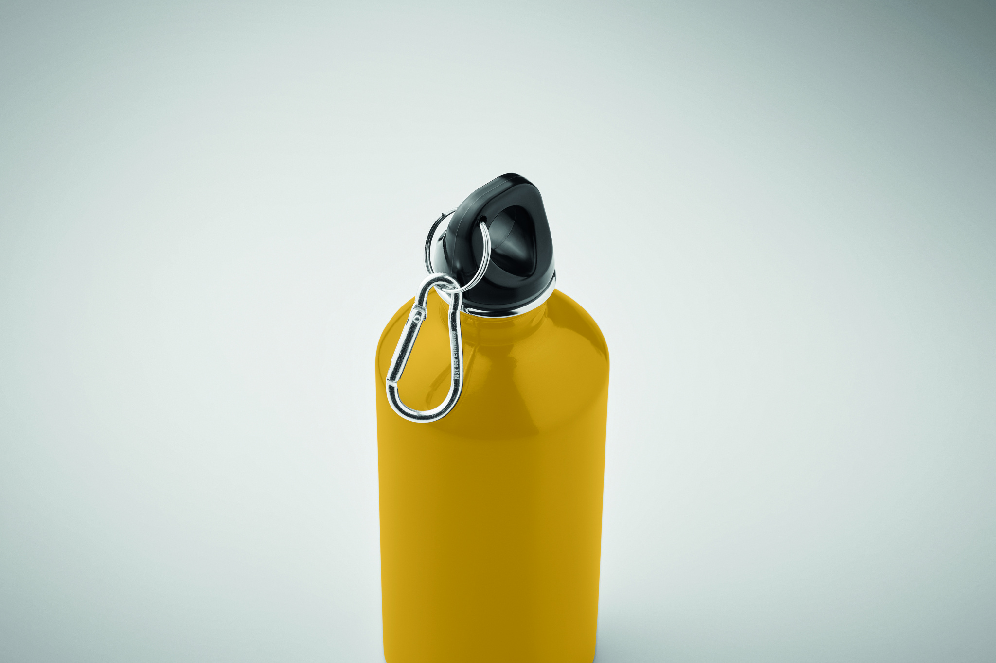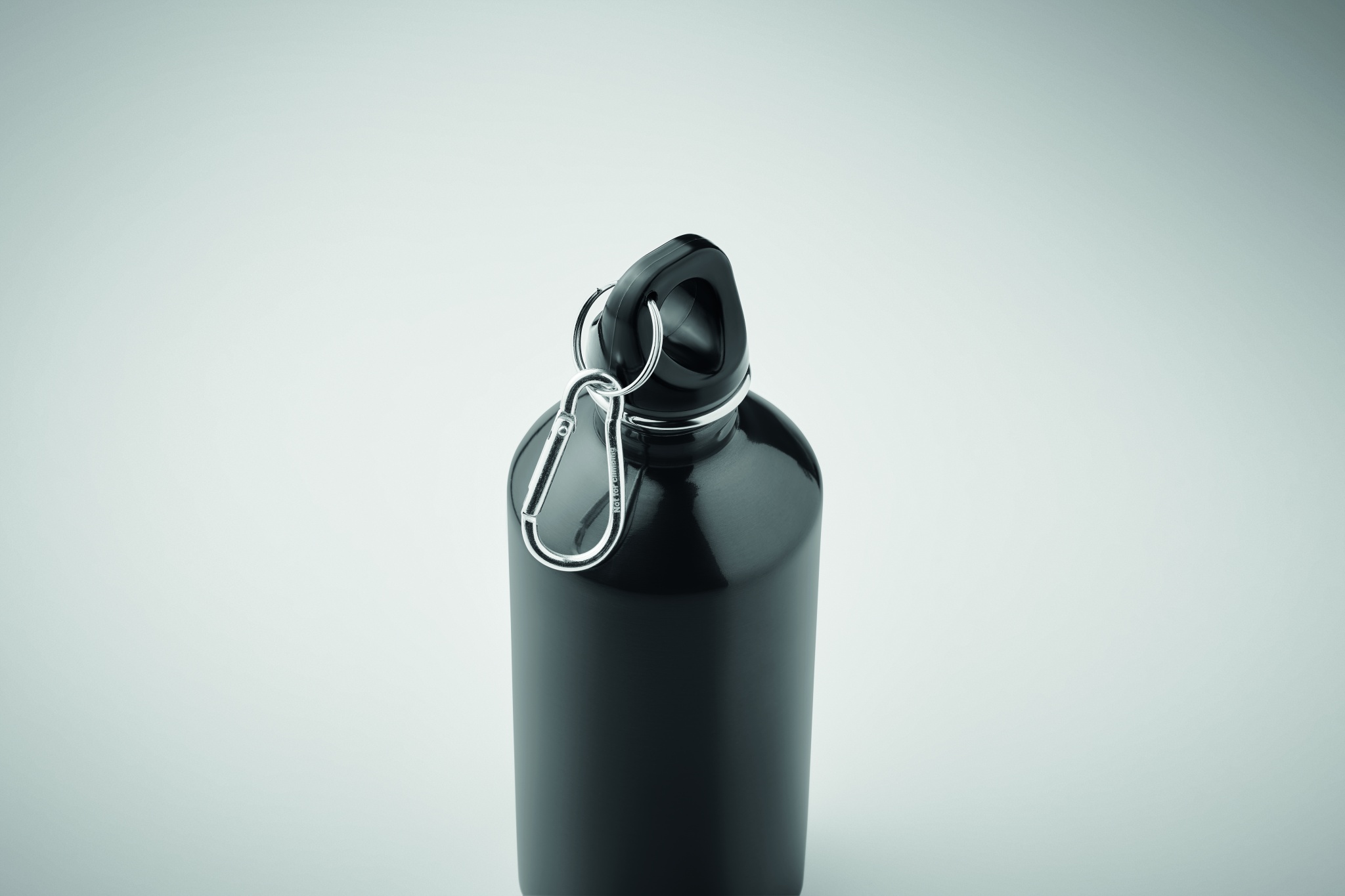 Single layer bottle in recycled stainless steel (90% recycled stainless steel and 10% stainless steel) with carabiner. 500 ml. Sublimation print available on white item only. Leak free.