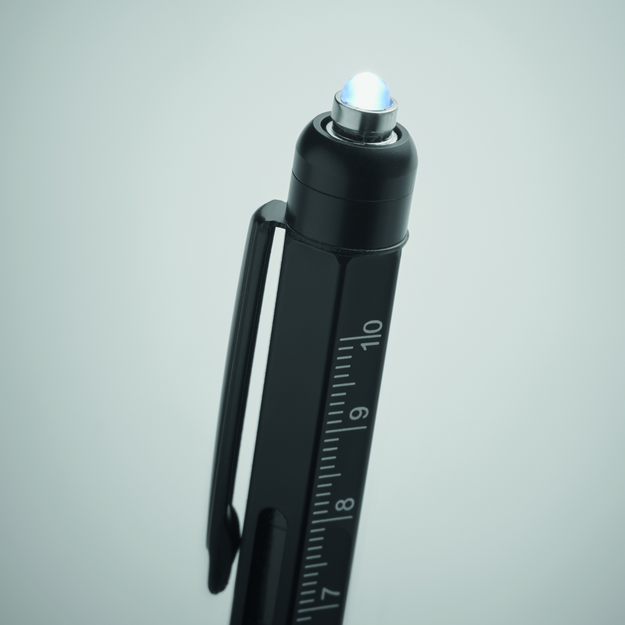 Поворотная шариковая ручка из нержавеющей стали с уровнем и линейкой. Есть также стилус, насадки для отверток с крестообразной и плоской головкой, фонарик. 3 батарейки AG в комплекте. Синие чернила.