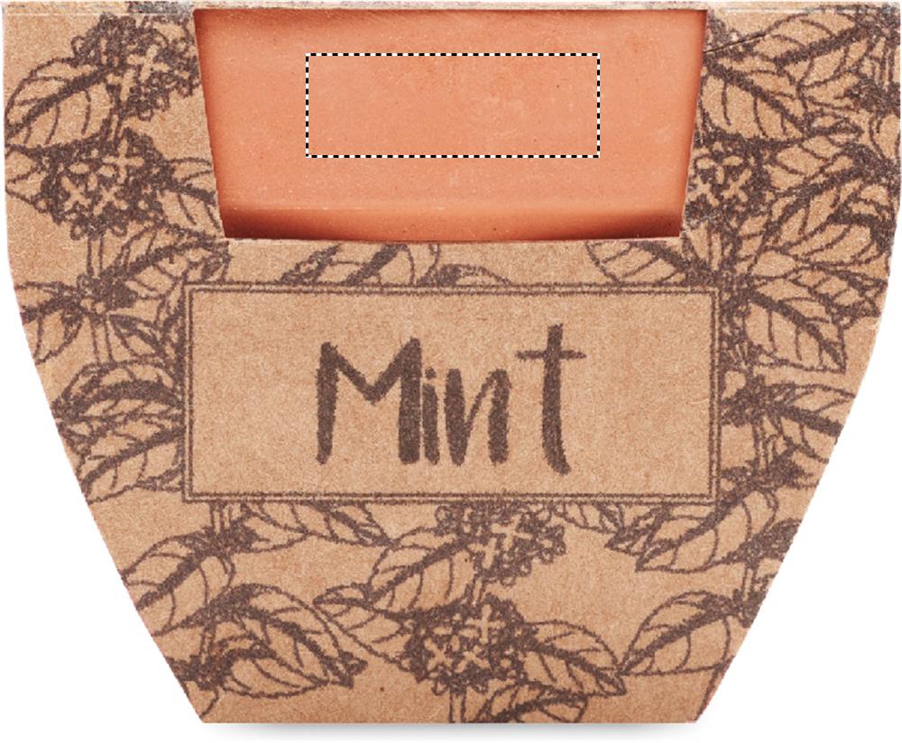 Небольшой глиняный терракотовый горшок с семенами мяты и землей для проращивания. Изготовлено в ЕС.