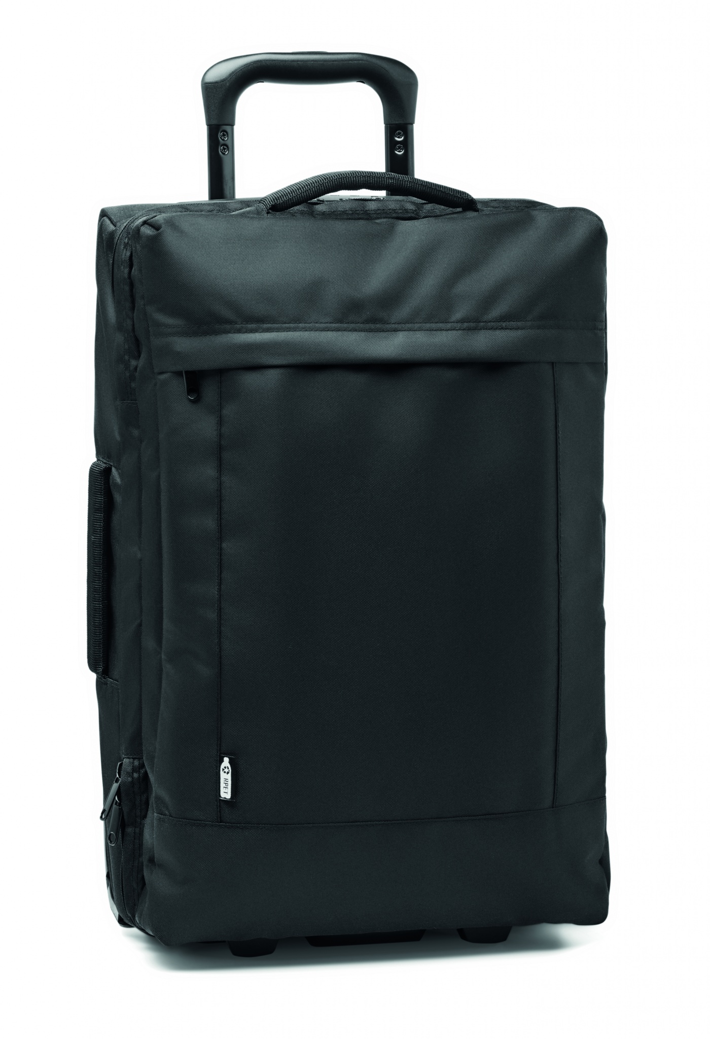 Тележка из полиэстера 600D RPET с мягкими боками. Два больших внутренних отделения на молнии. Один передний карман на молнии, боковая и верхняя ручки. Комбинированный замок и двойная рама. 2 колеса.