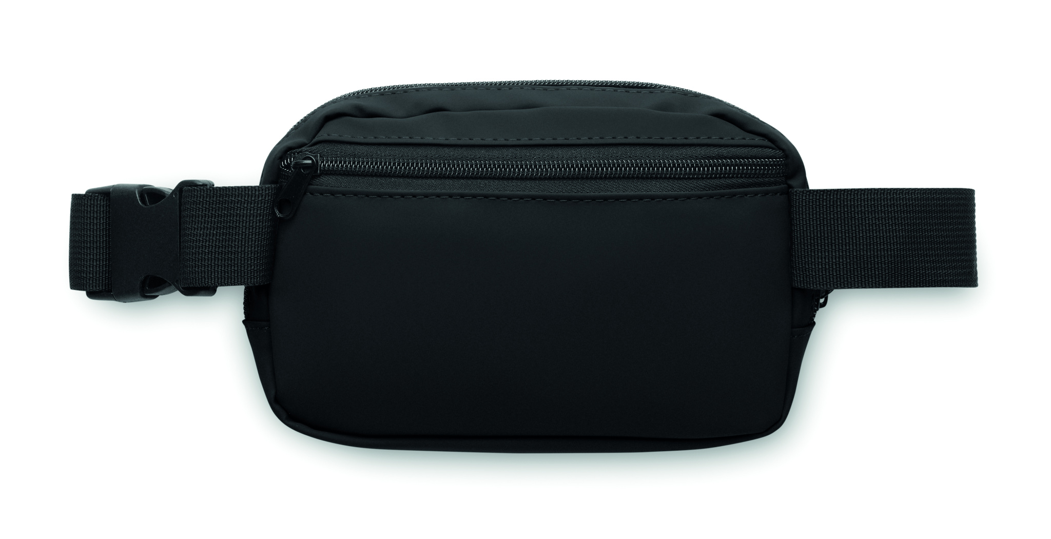 Waist bag or cross body bag in soft PU with 210D RPET polyester lining. 1 main zippered pocket, 1 back zippered pocket and mesh inside compartment.